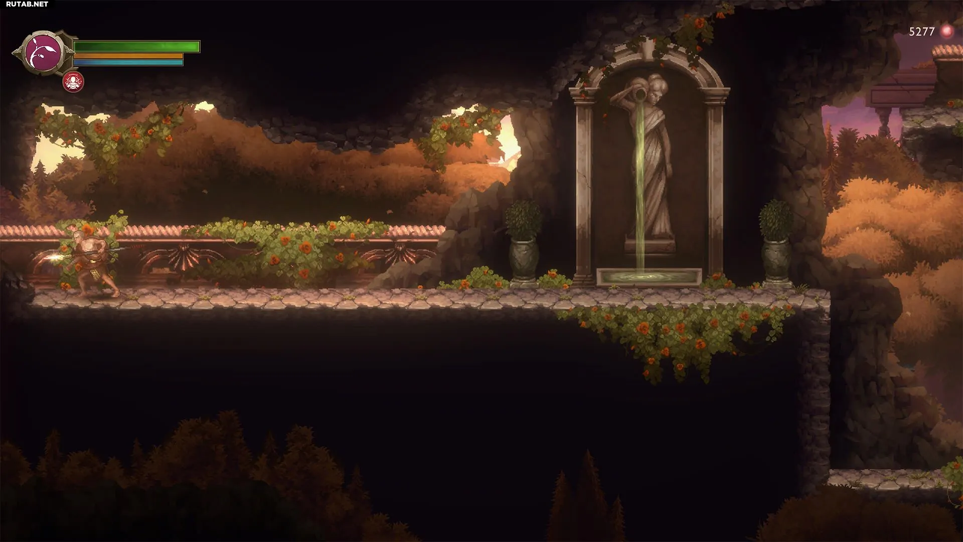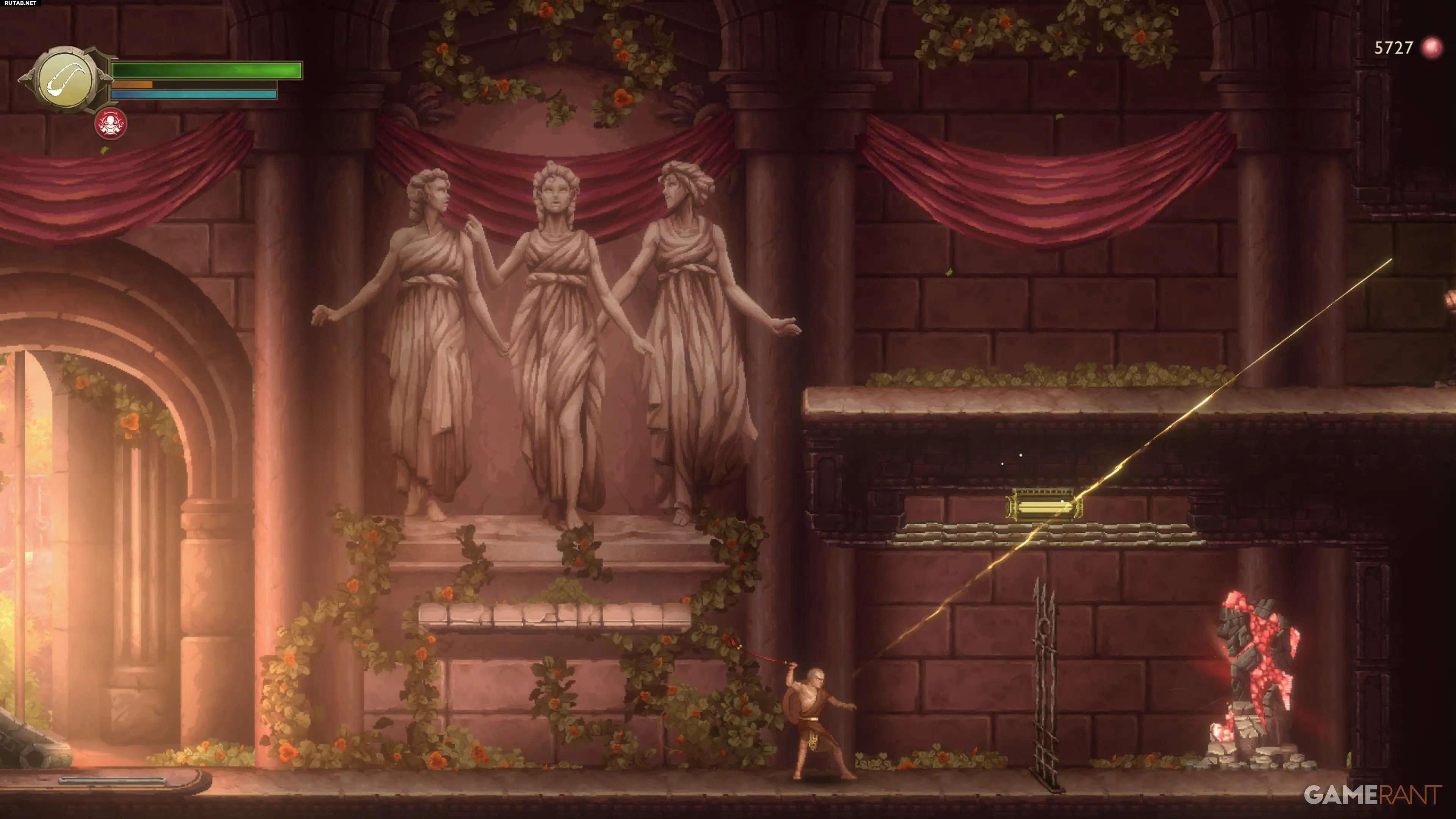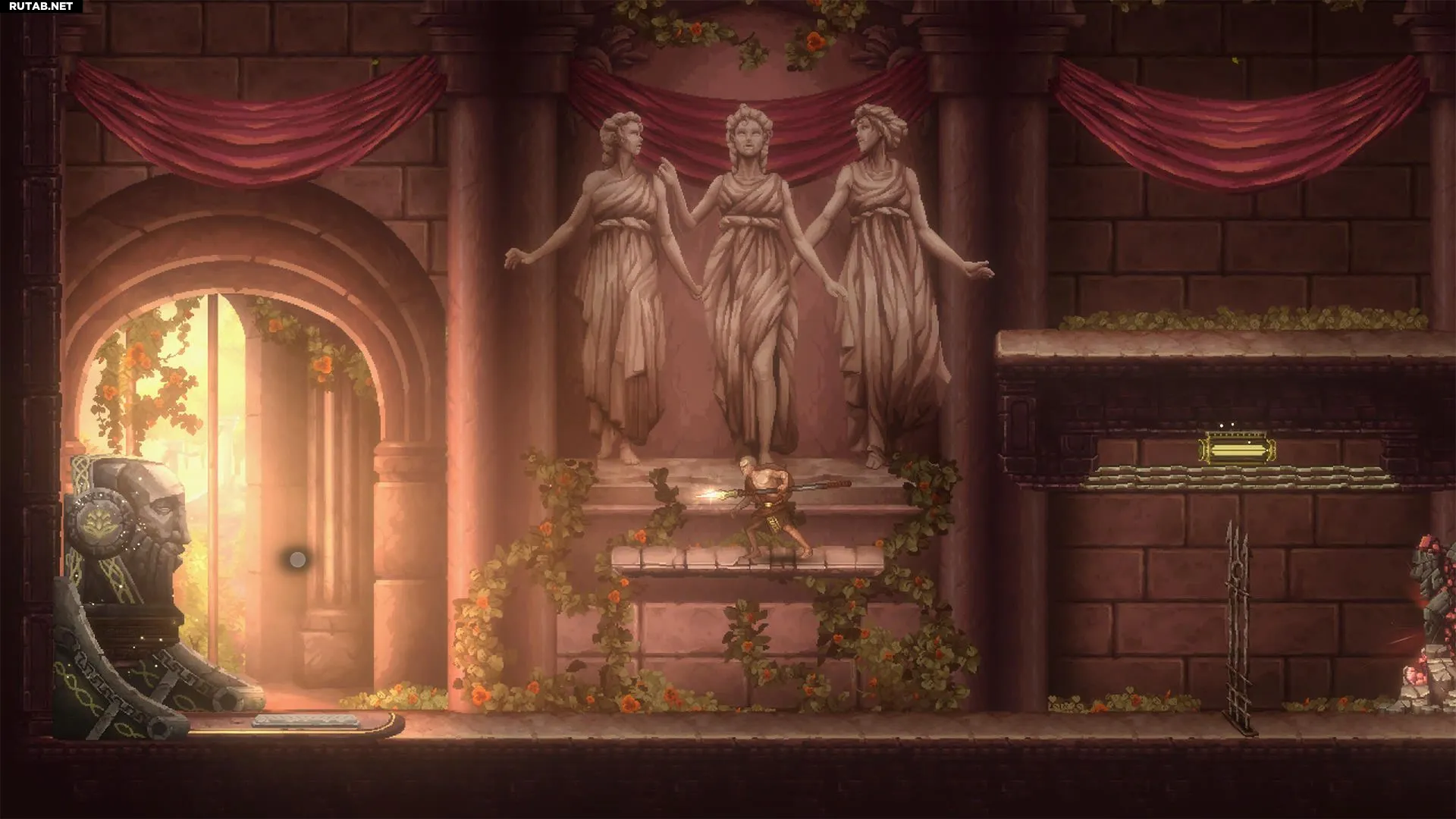 Войдя в Святилище, идите в самую левую часть зала. Вы увидите каменный фонтан с женщиной, держащей урну, перед тупиковым проходом. Подойдите к левой стене и разбейте её атакой копьём. За ней откроется скрытый путь к Священному Монументу.