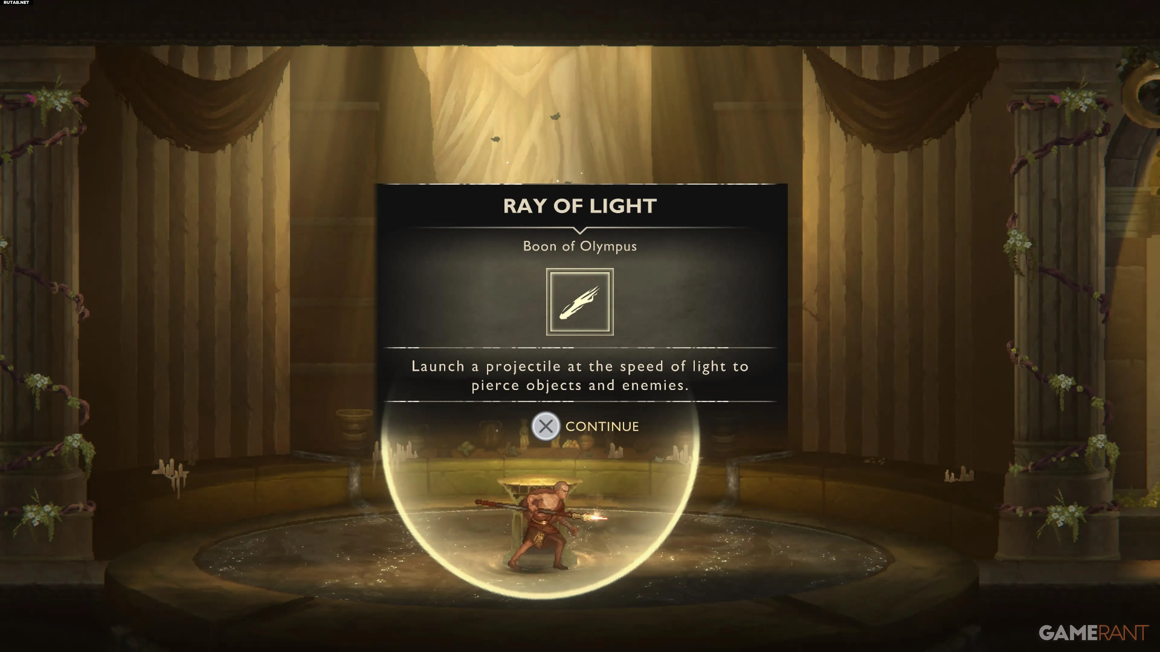Взаимодействуйте с монументом, чтобы получить Бессмертный Гиацинт. Теперь нужно вернуться в Храм Аполлона и поднести цветок к центральному алтарю, чтобы улучшить Солнечную Пращу.