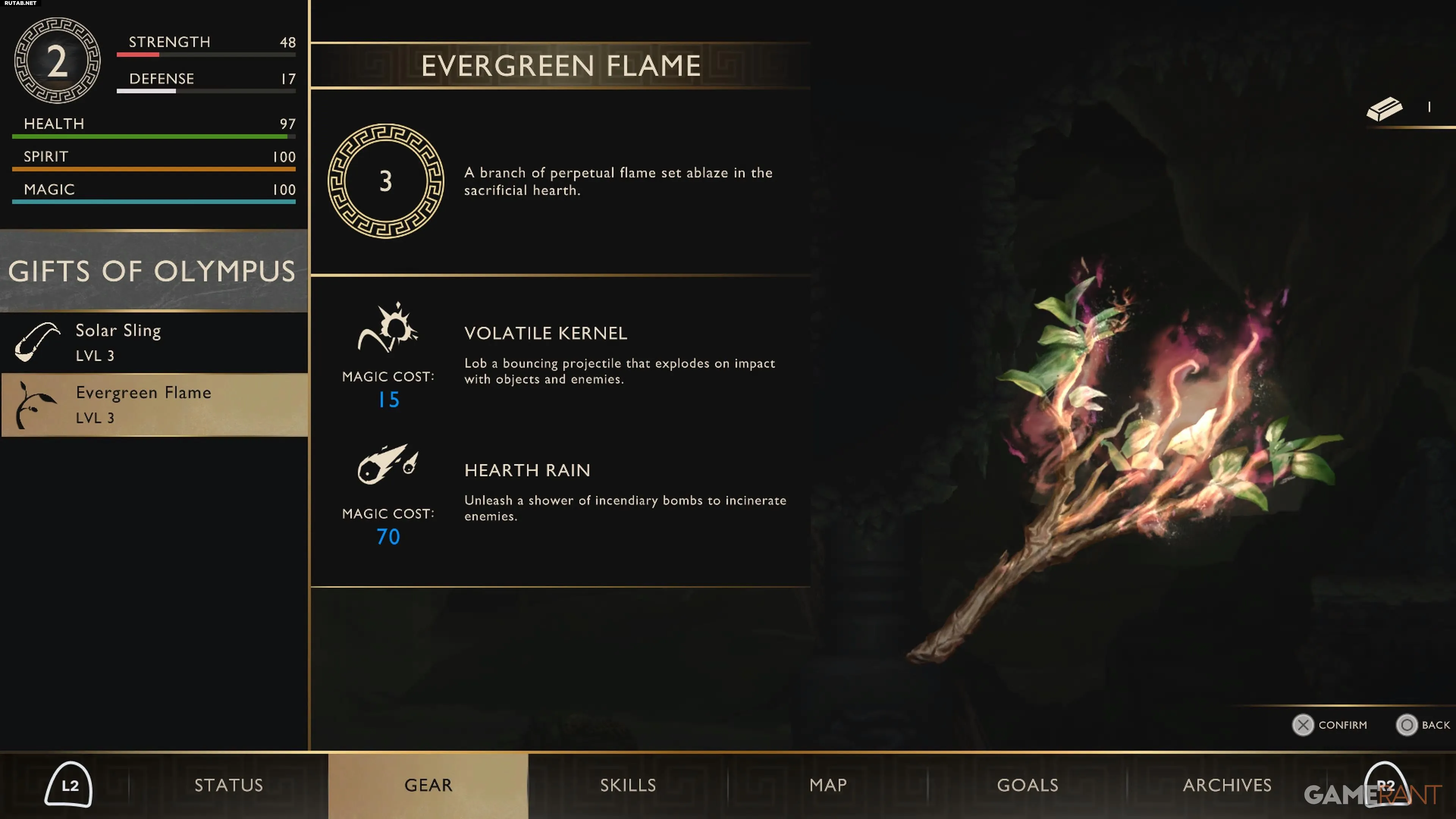 Чтобы уничтожить барьеры из шипов, вам понадобится разблокировать второй Дар Олимпа — «Вечное Пламя». Этот предмет дает доступ к двум магическим атакам: