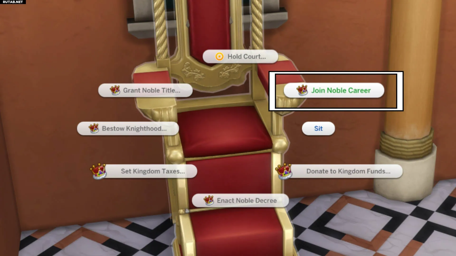 Вы можете купить трон в режиме строительства, разместить его на своём участке и взаимодействовать с ним, чтобы присоединиться к карьере дворянина.