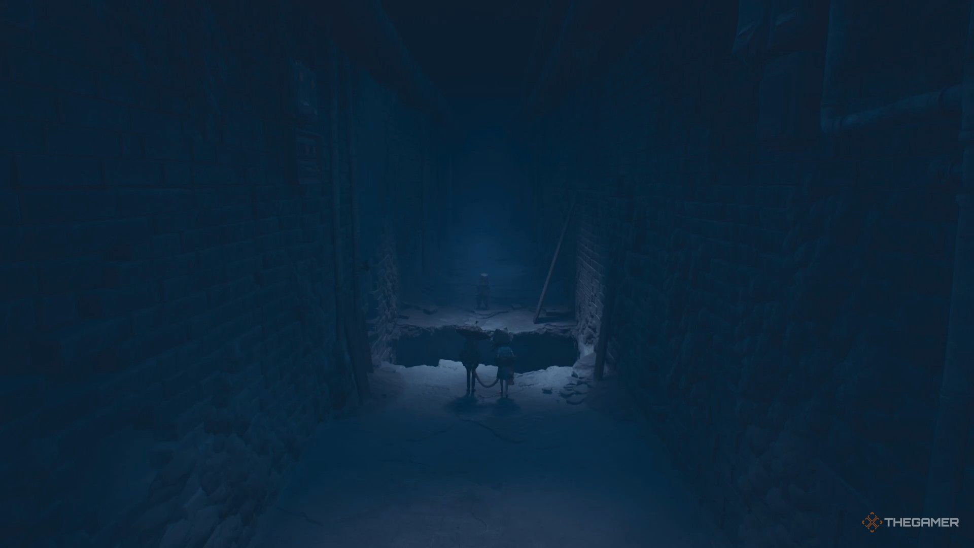 По ту сторону этого разрыва находится большая дыра в стене. Бегите вперёд, но не пытайтесь перепрыгнуть пропасть. Вместо этого подождите, пока ваш друг на другой стороне опустит деревянную доску, чтобы сделать мост для вас и девочки-сироты.
