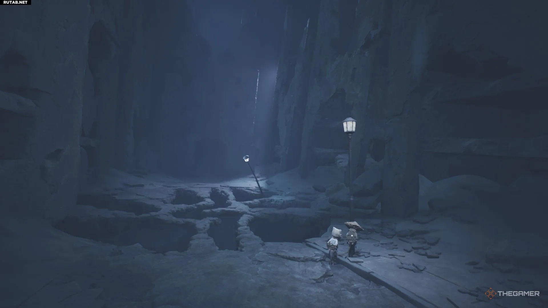 Перейдите пропасть по доске, прежде чем подойти к следующему фонарю. Однако взаимодействие с ним вызовет обвал пути впереди, оставив лишь тонкие выступы, перекинутые через провал.