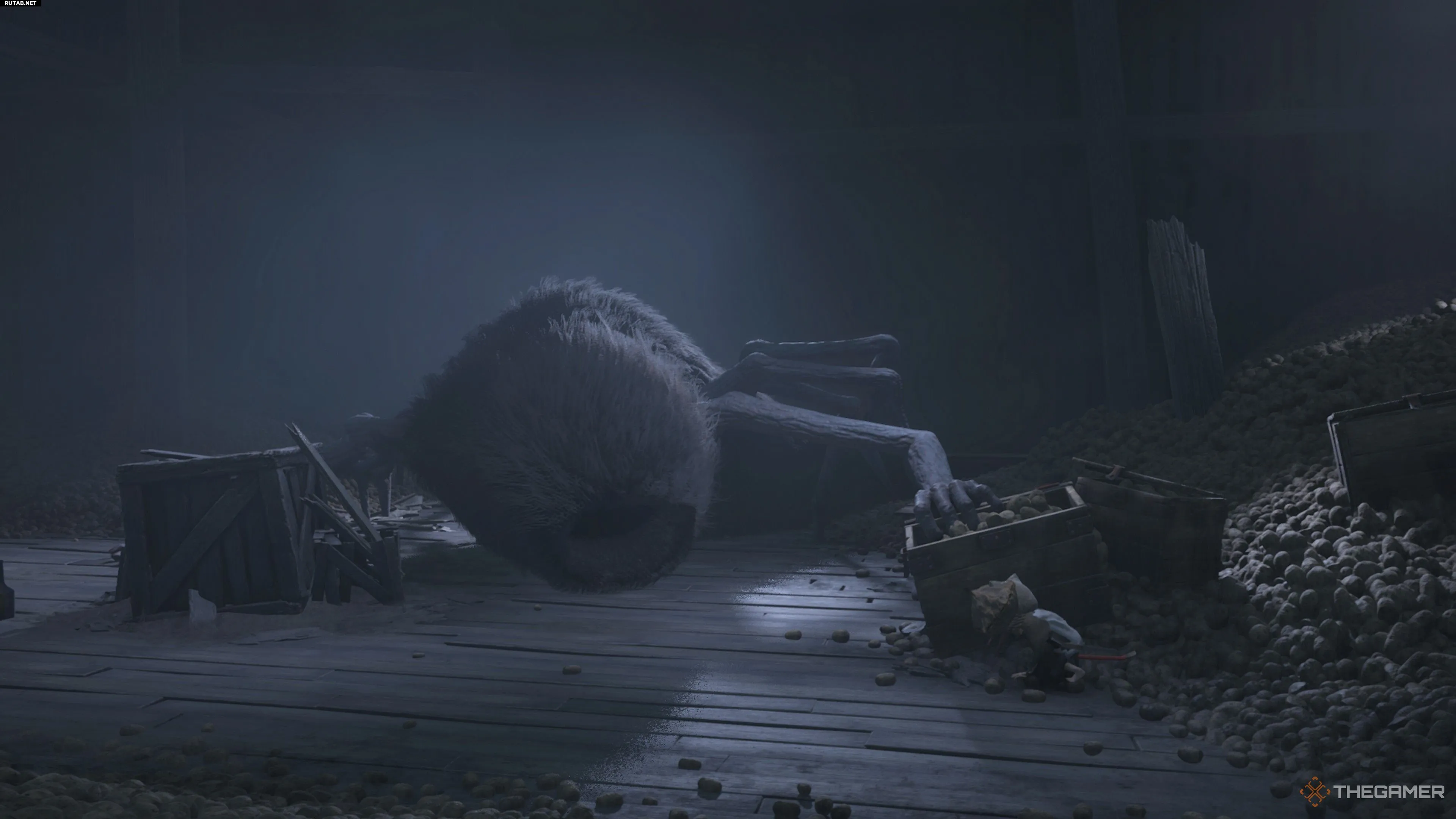 Страх свиньи был не напрасен — с другой стороны трещины вас поджидает огромный мохнатый паучий монстр, Мать. Она спрыгивает со своей позиции, хватает вашего друга и выплёвывает нескольких Паучьих Детей, которые пойдут за вами. Бегите через мост — сейчас вы не можете помочь другу — и пройдите в проём на другой стороне.
