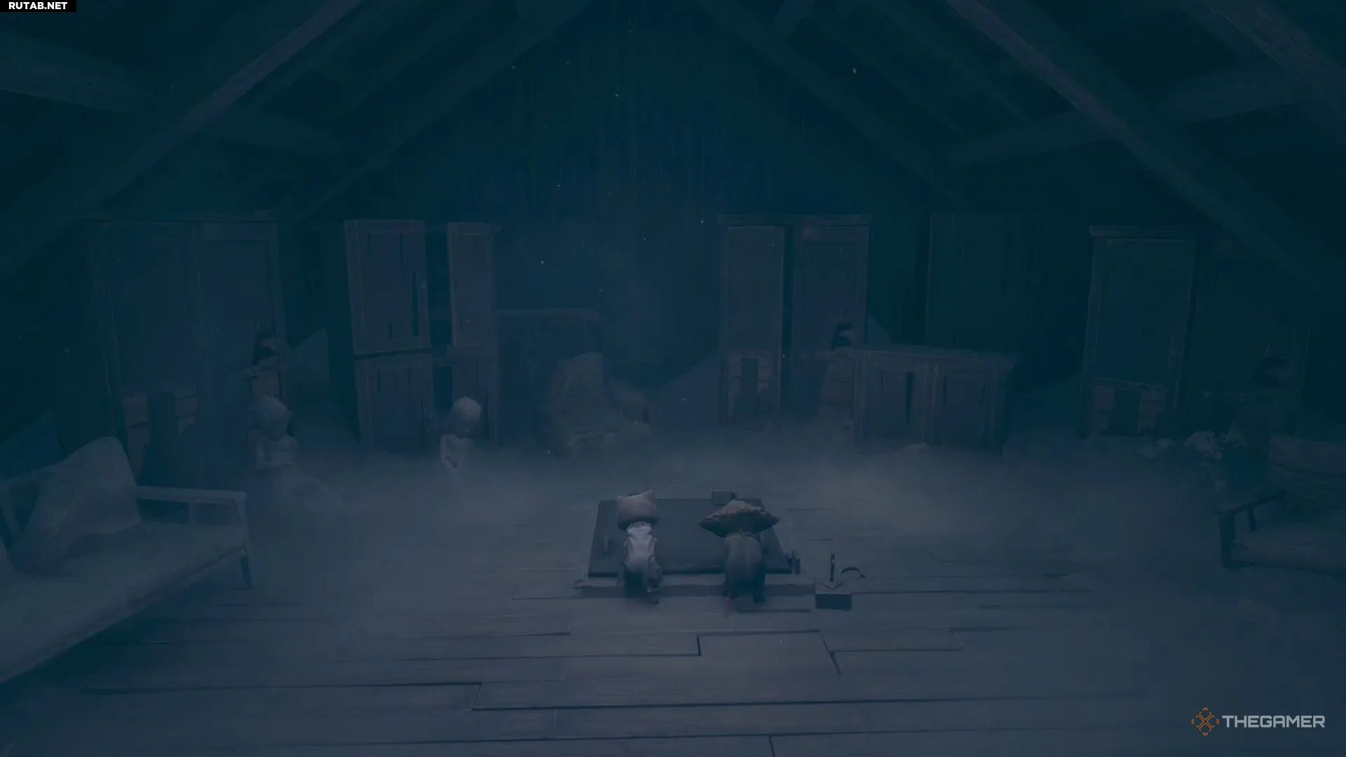 Поднимитесь на платформу и двигайтесь по ней в сторону камеры, как только окажетесь на твёрдой земле. Перепрыгните через балку, лежащую на пути, и быстро доберитесь до опрокинутого шкафа слева, чтобы использовать его как платформу и пробежать по нему через завалы. Продолжайте бежать в сторону камеры и осторожно перейдите по деревянным балкам на другую сторону. Просуньтесь в отверстие в стене в конце этого пути, чтобы достичь следующей контрольной точки — и головоломки с боссом в этой части Reanimal.