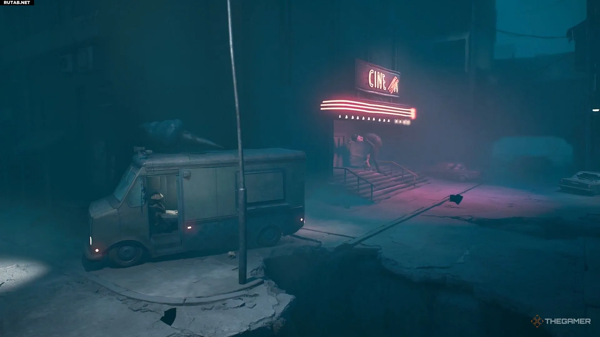 Пройдите вниз через проход между машинами в нижней части экрана, но сверните налево, обойдя путь через пустое парковочное место, чтобы увернуться от «кожаного костюма», идущего вам навстречу по центральной дорожке. Затем вернитесь направо и взбегите по обломкам, перепрыгнув через забор, чтобы вернуться к самому кинотеатру.