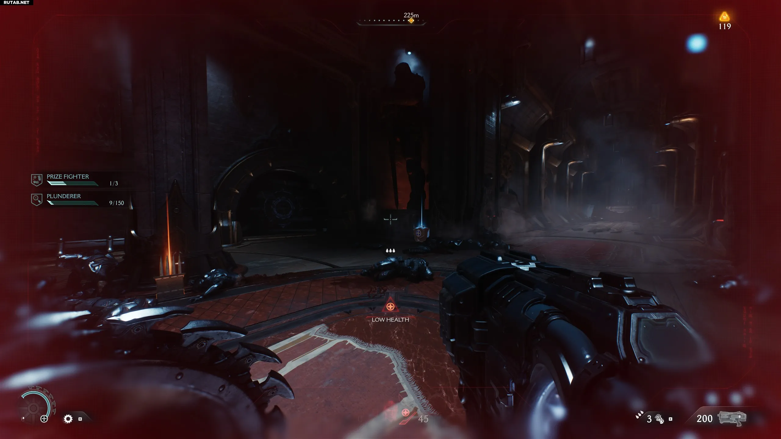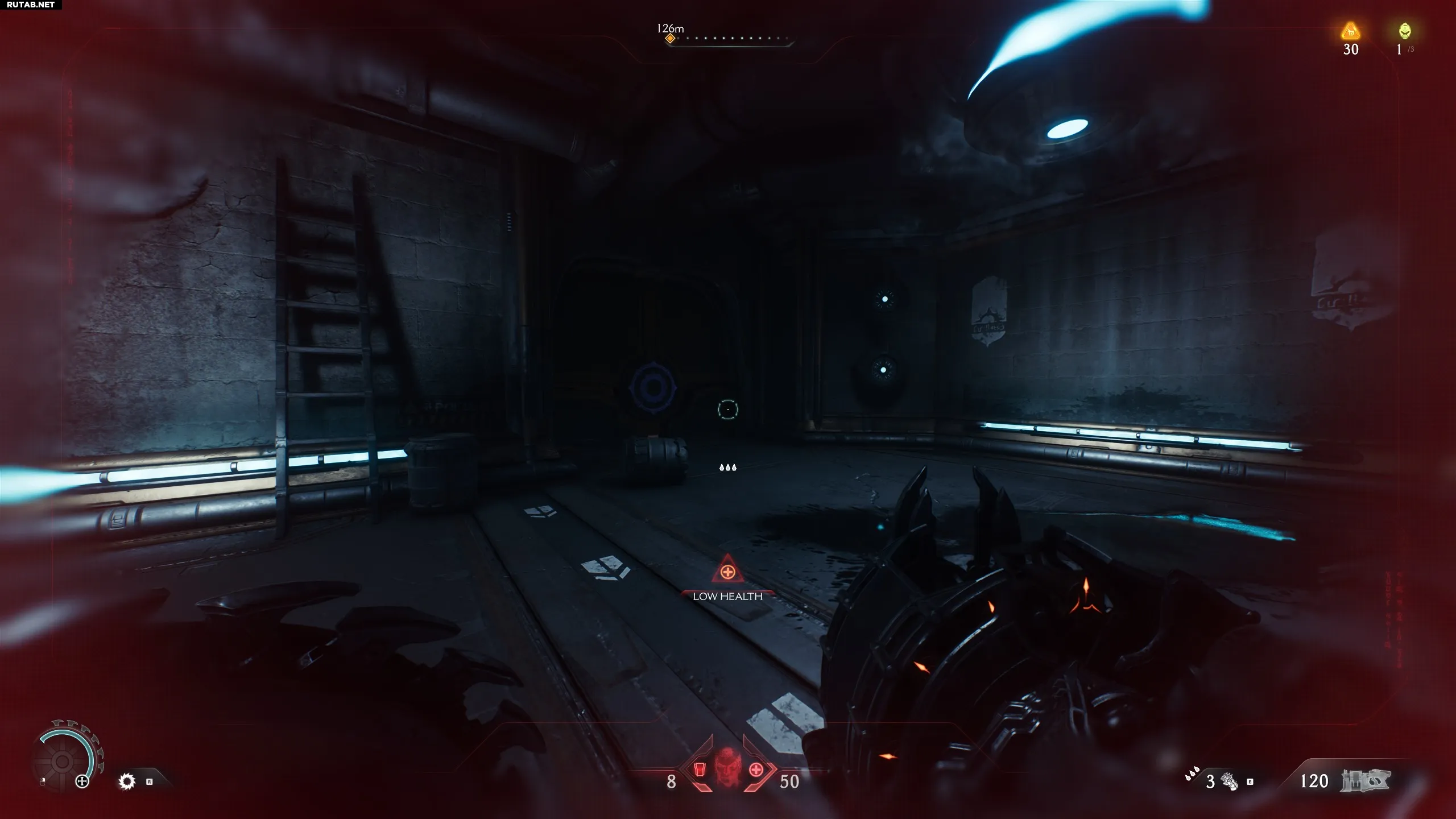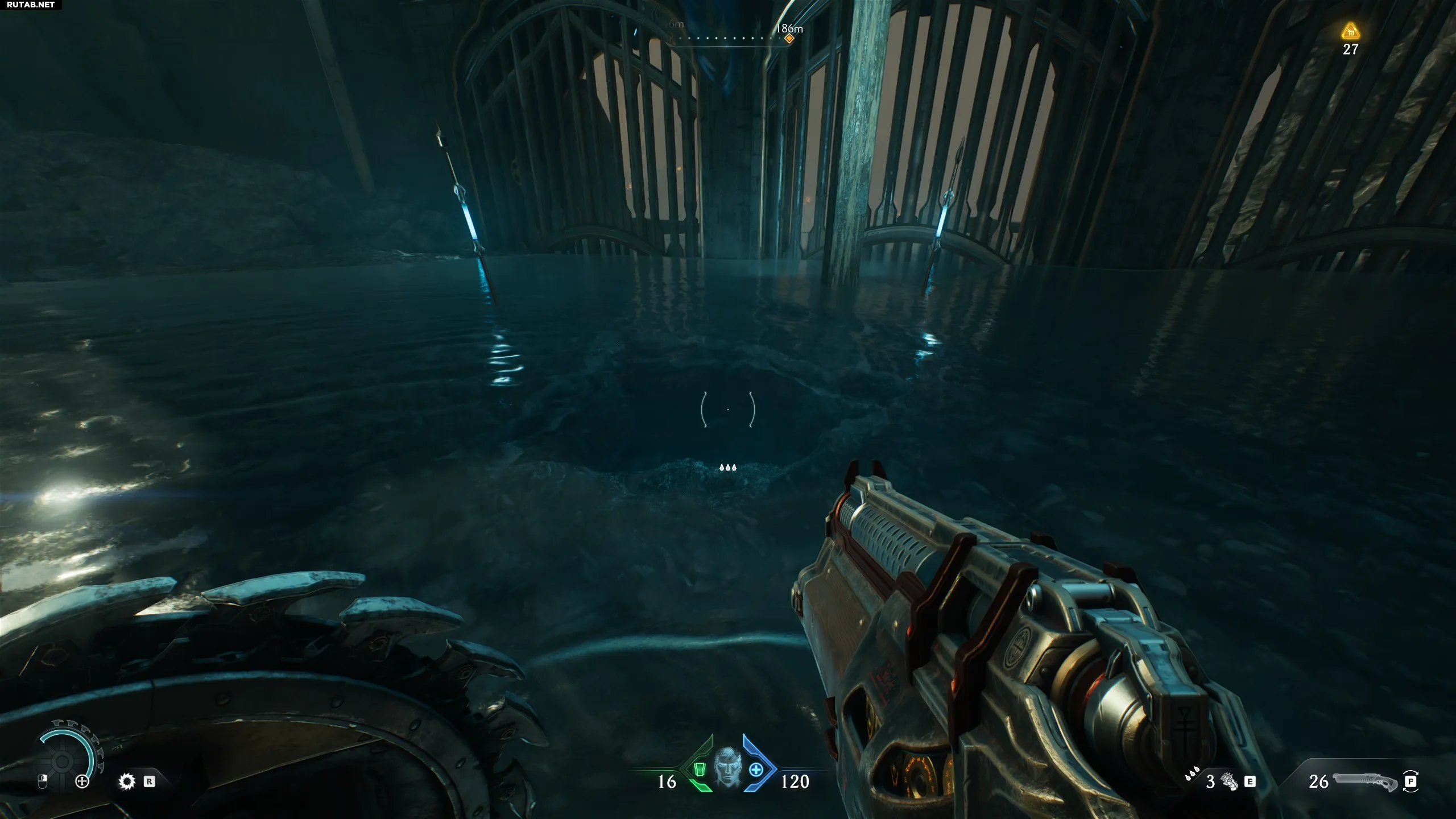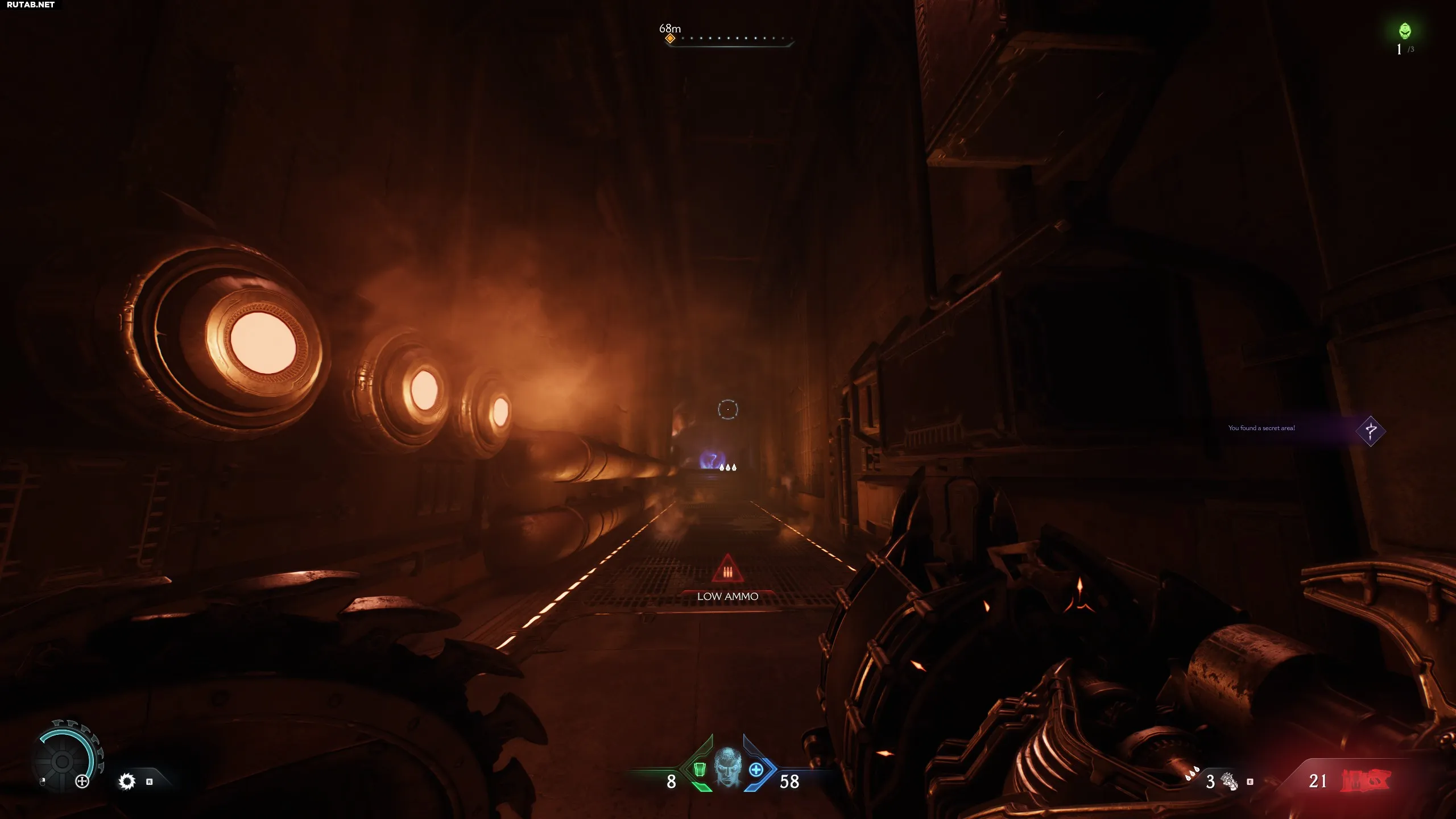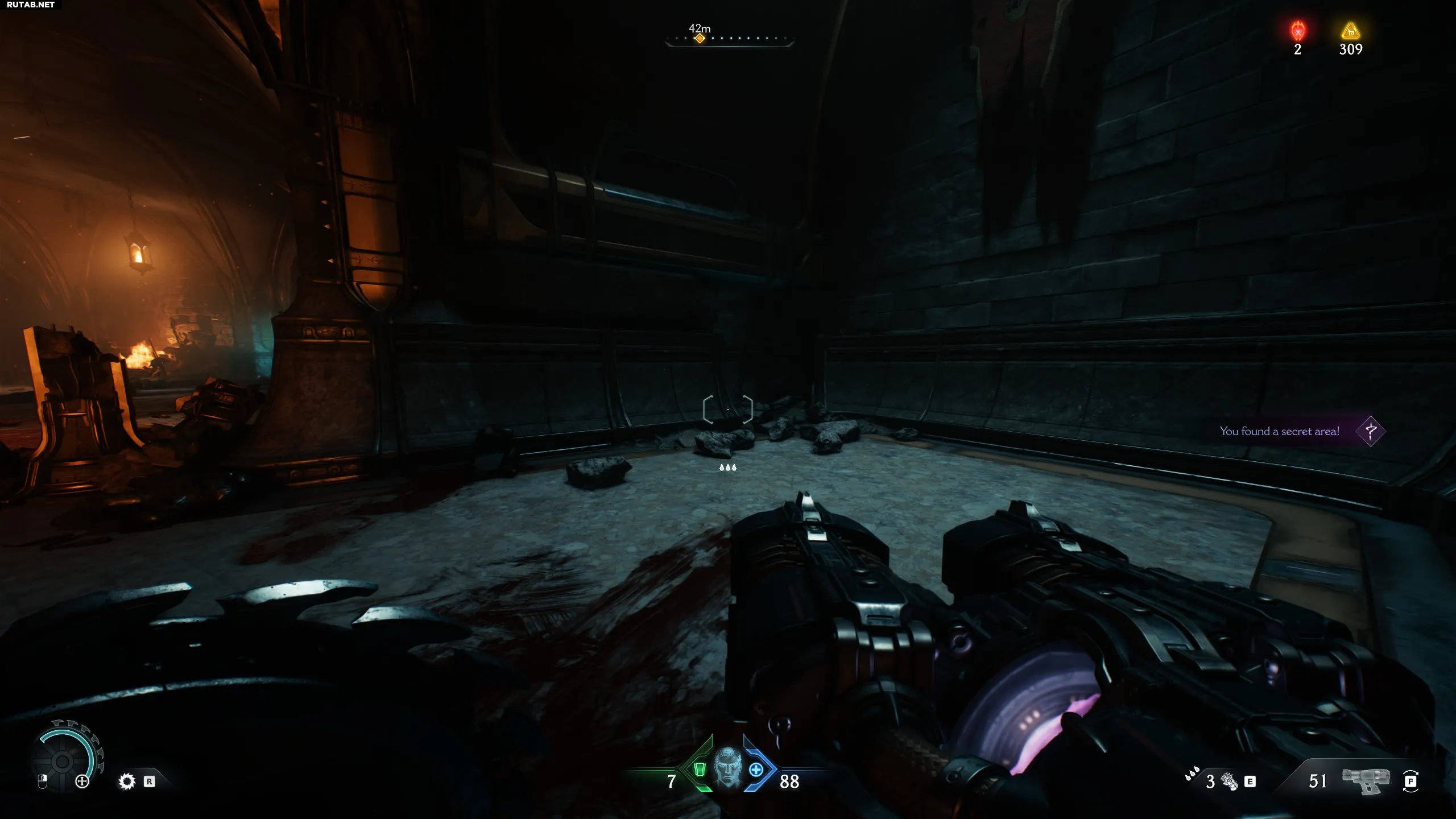 В комнате, где нужно собирать золотые жетоны (нужны для улучшения оружия, щитов и перчатки), идите вперёд в коридор. Поверните налево и снова налево. Взберитесь по стене, чтобы найти секрет.