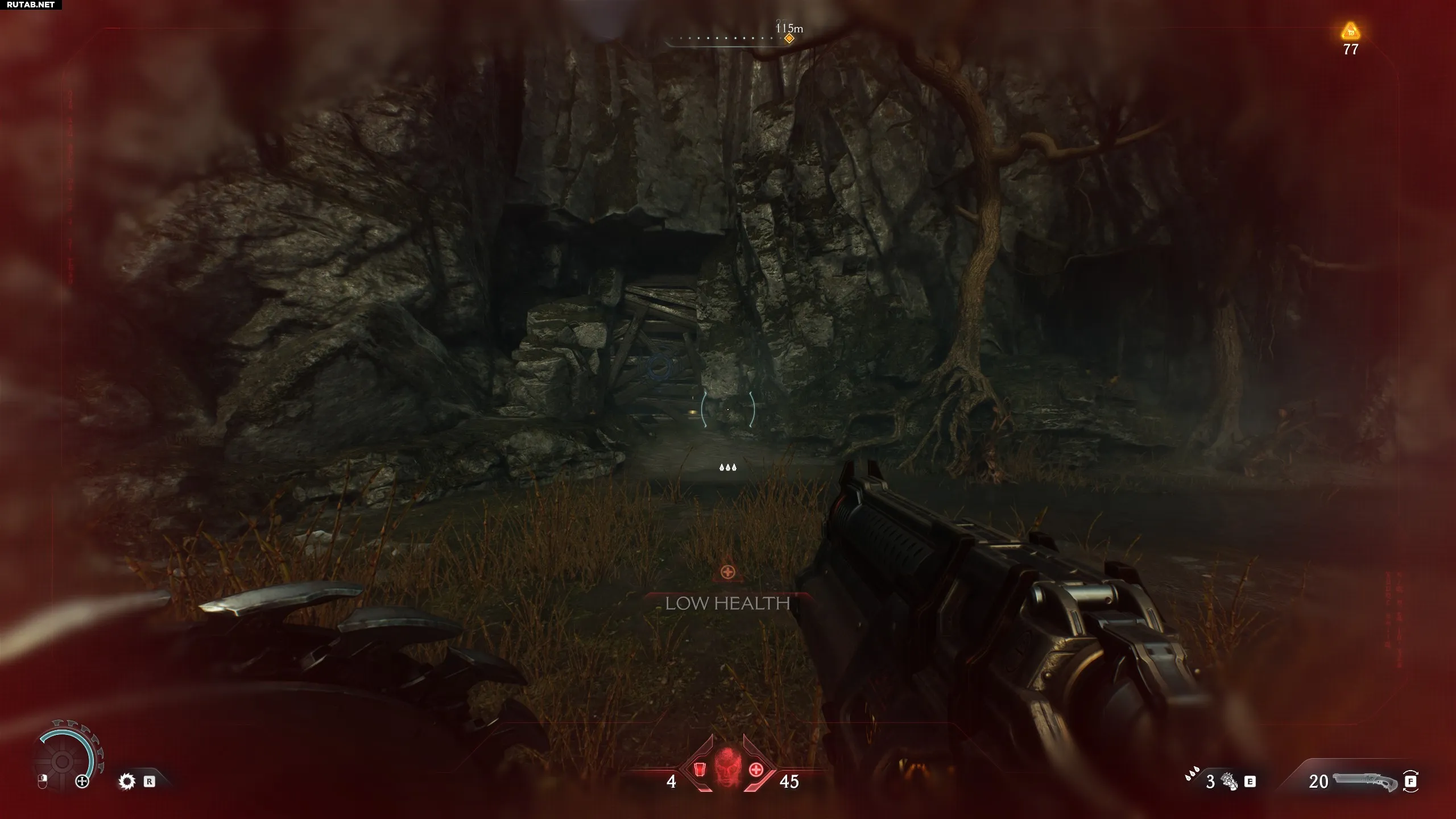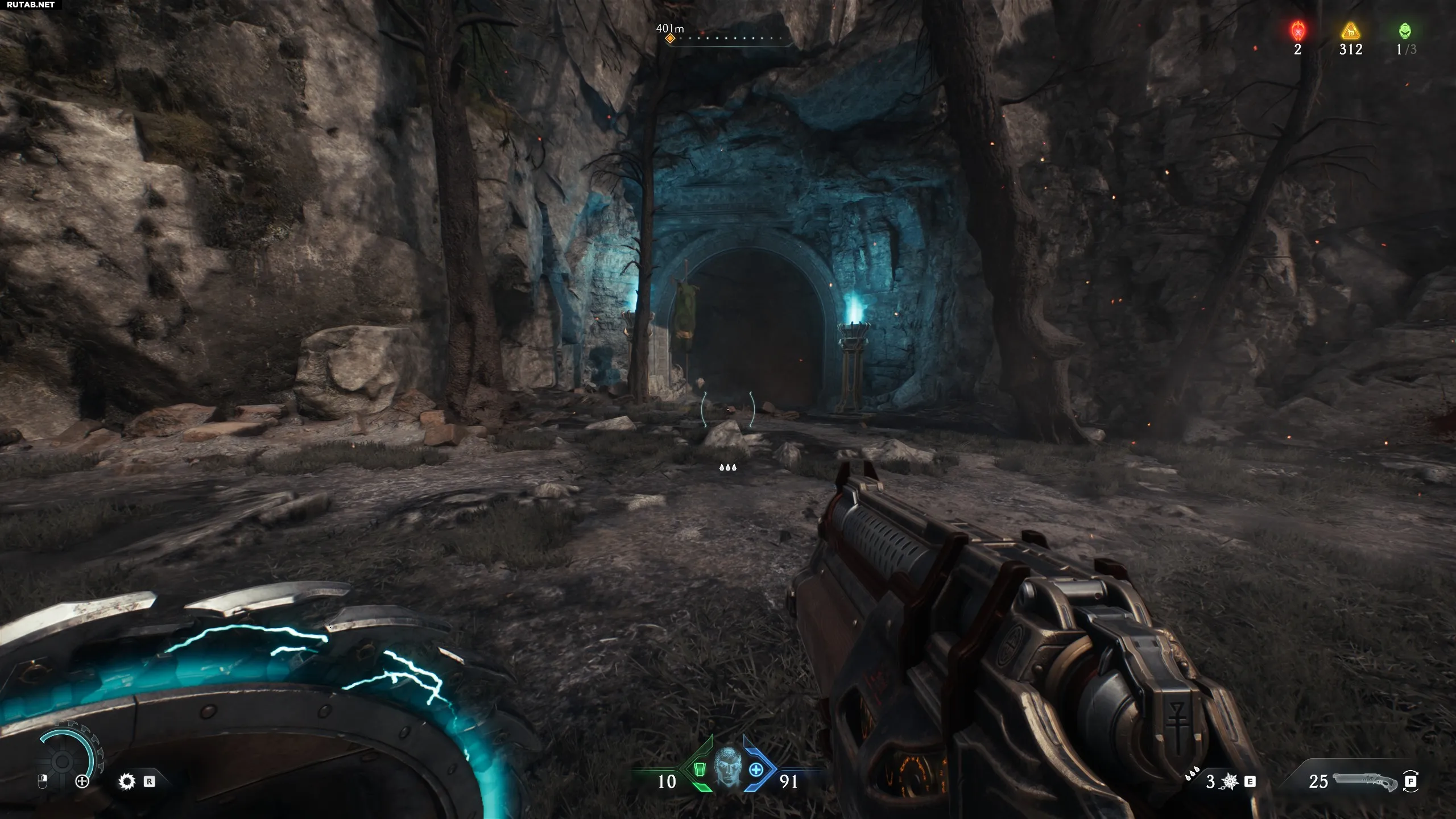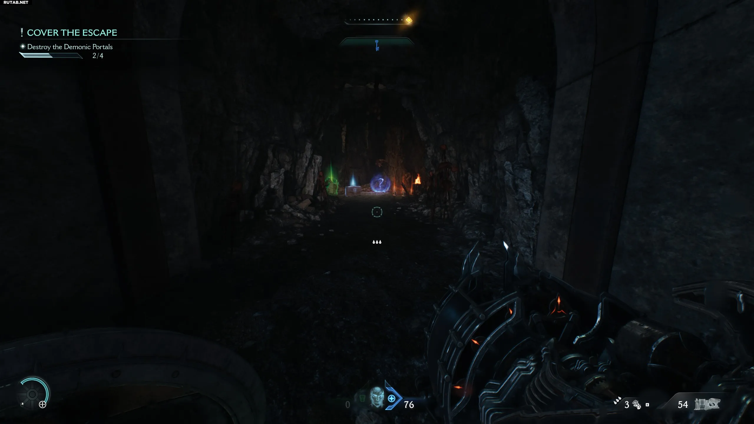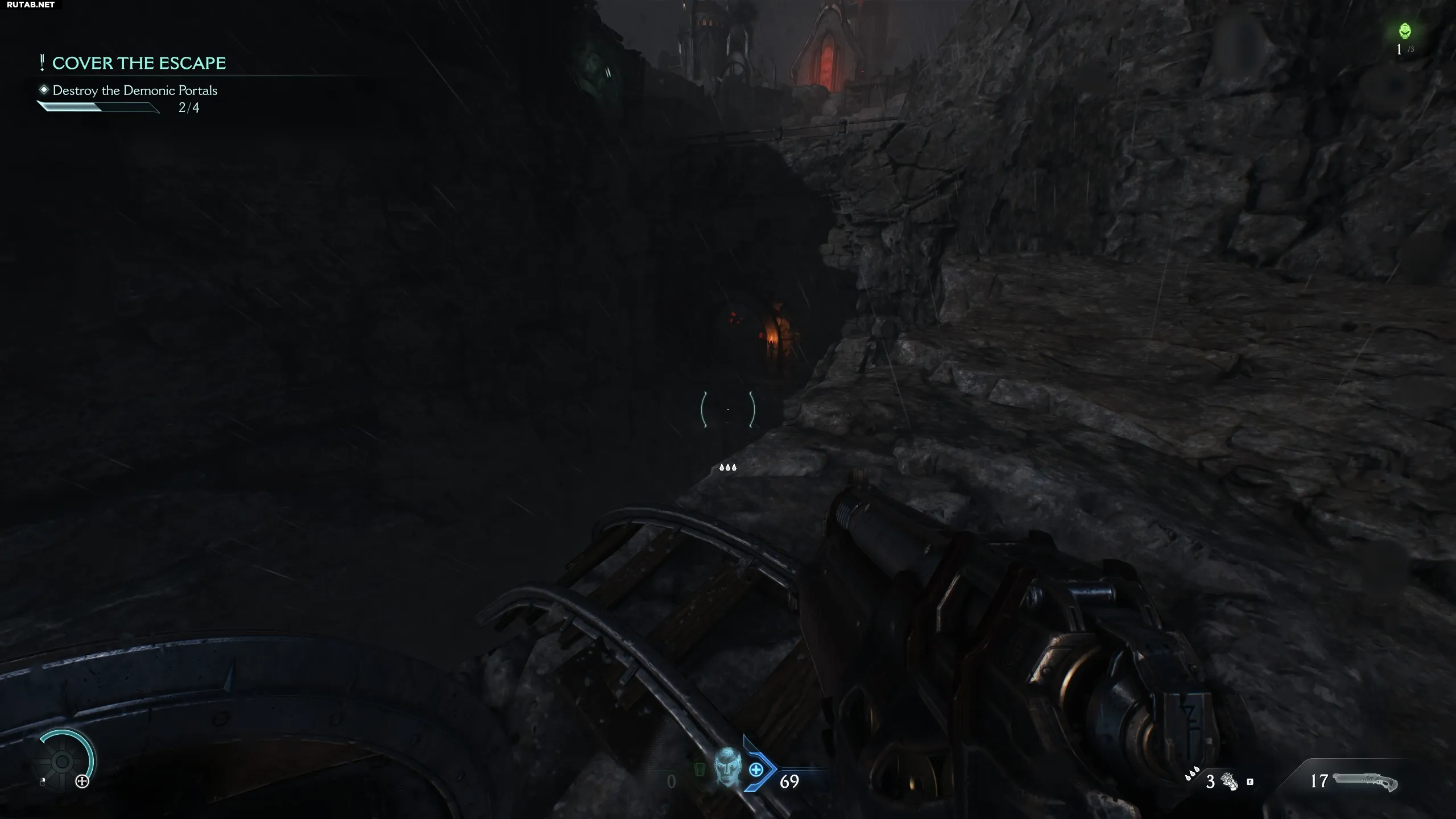 После открытия синих ворот начнётся последовательность, в которой вам нужно очистить 4 зоны с 4 порталами (по одному на зону). Очистите первую зону, поверните налево и перейдите ко второй, также очистив её. Зайдите в пещеру и, выйдя из неё, поверните налево. Вы увидите пещеру прямо под второй очищенной зоной. Запрыгните в неё, чтобы найти секрет (скин для дробовика).