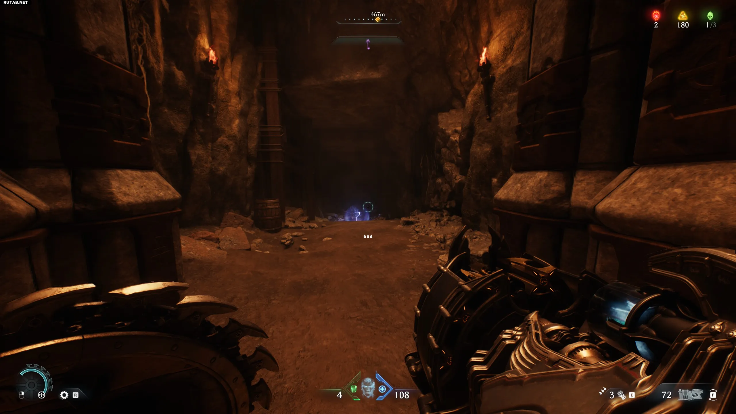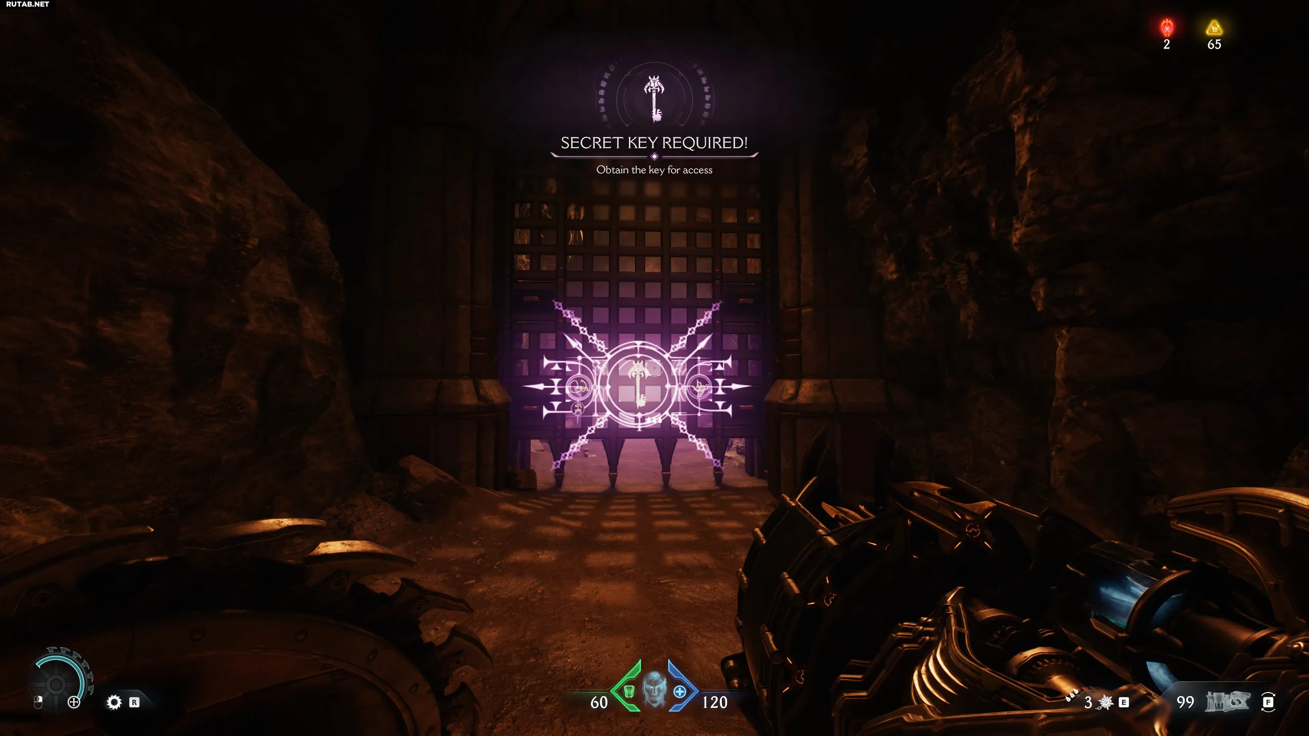 Немного дальше, после боя с ревенантом и парой адских рыцарей, вы попадёте в столовую. Поверните направо и проломите стену. Внутри вас ждёт много золота и фиолетовый ключ.