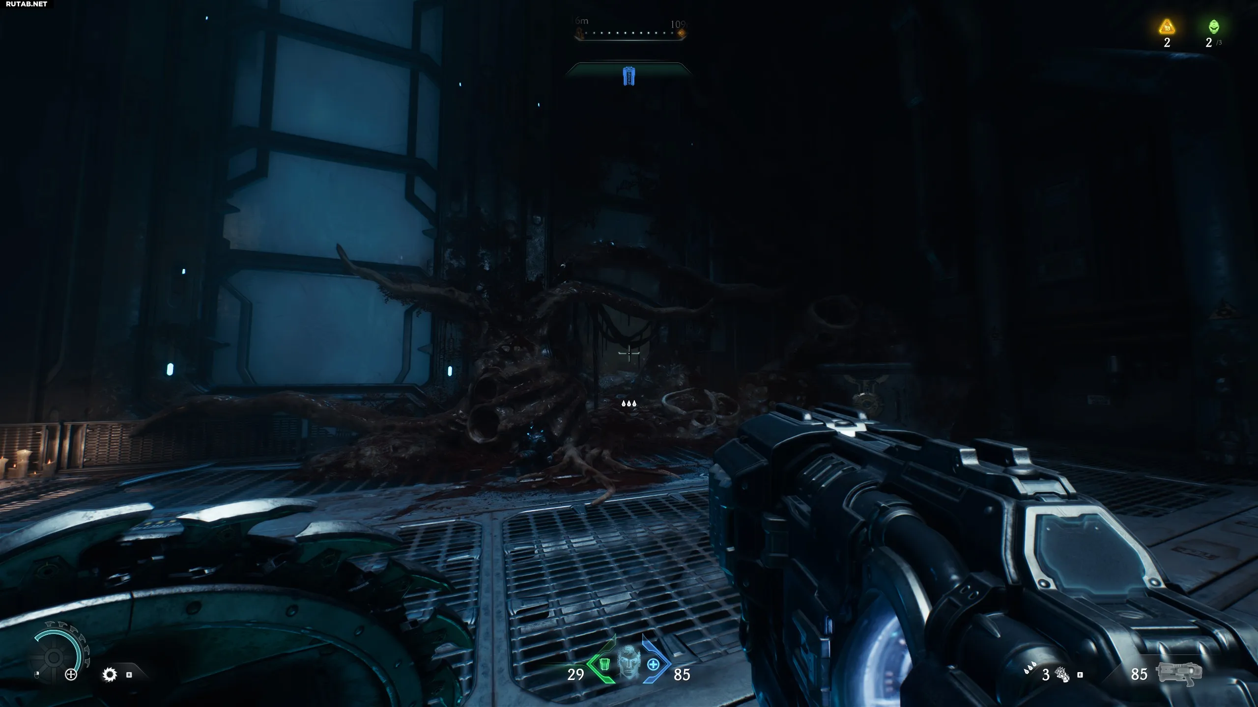 В комнате, из стены которой вылезает демон. Очистите зону, поднимитесь по лестнице и идите направо. Там над парой ящиков будет вентиляция. Залезьте внутрь.