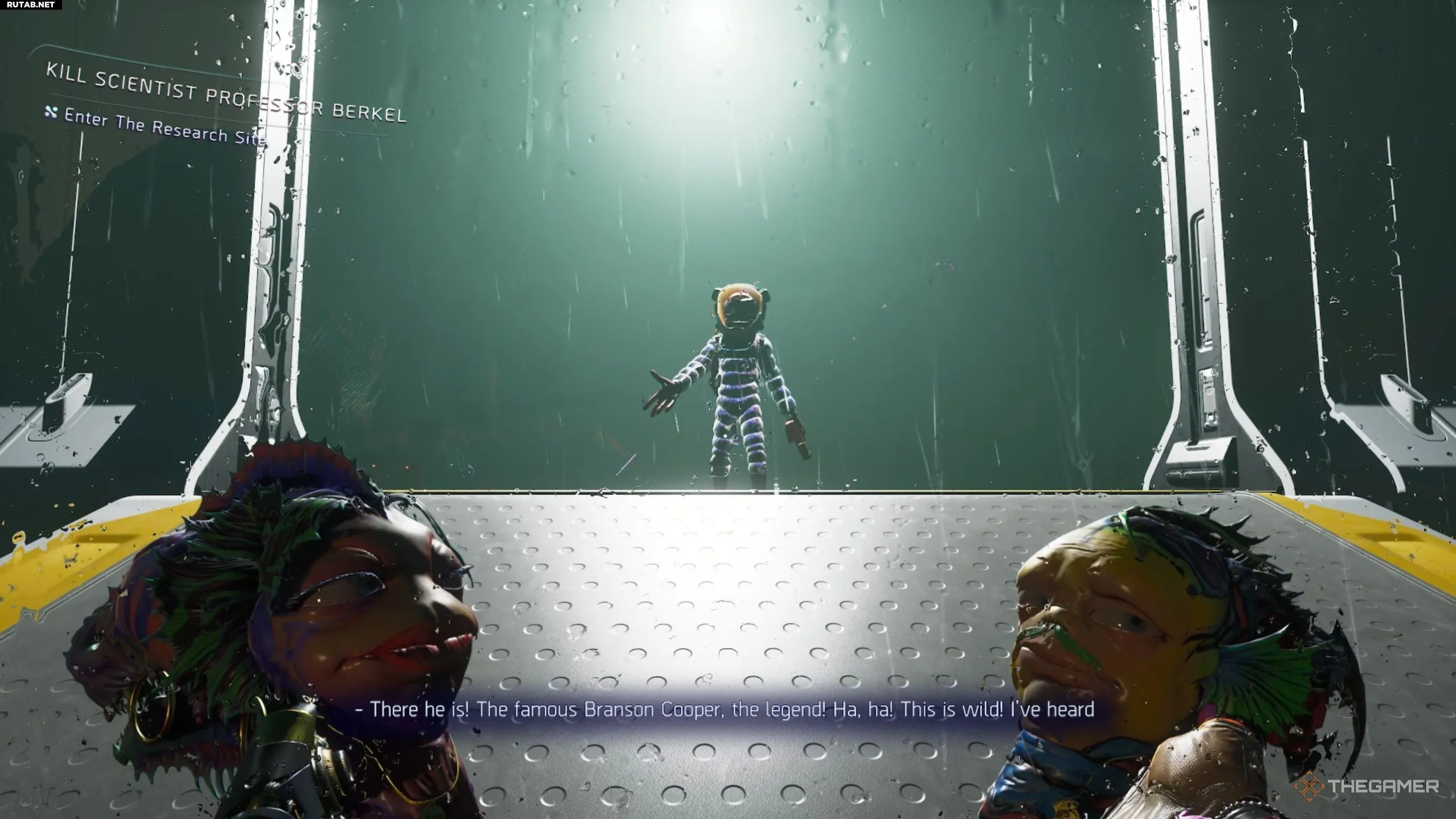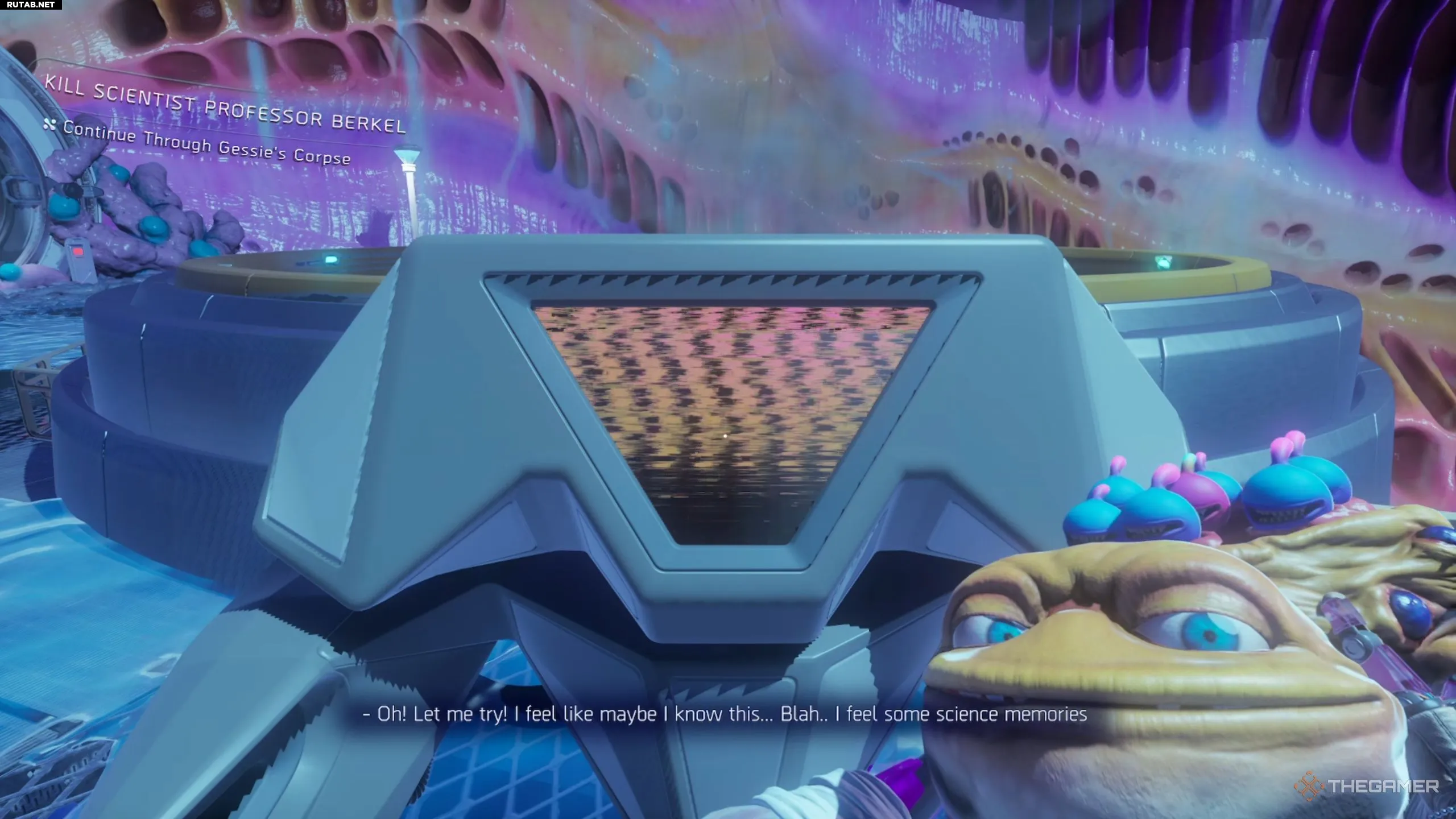 Оказавшись внутри пасти Гесси, вам предстоит пройти через несколько различных зон, чтобы наконец добраться до профессора Беркеля. В первой зоне учёный, которого вы встретите, попросит вас откалибровать биометр. Чтобы сделать это без применения силы, взаимодействуйте с компьютером и выберите в диалоге вариант «Существо».