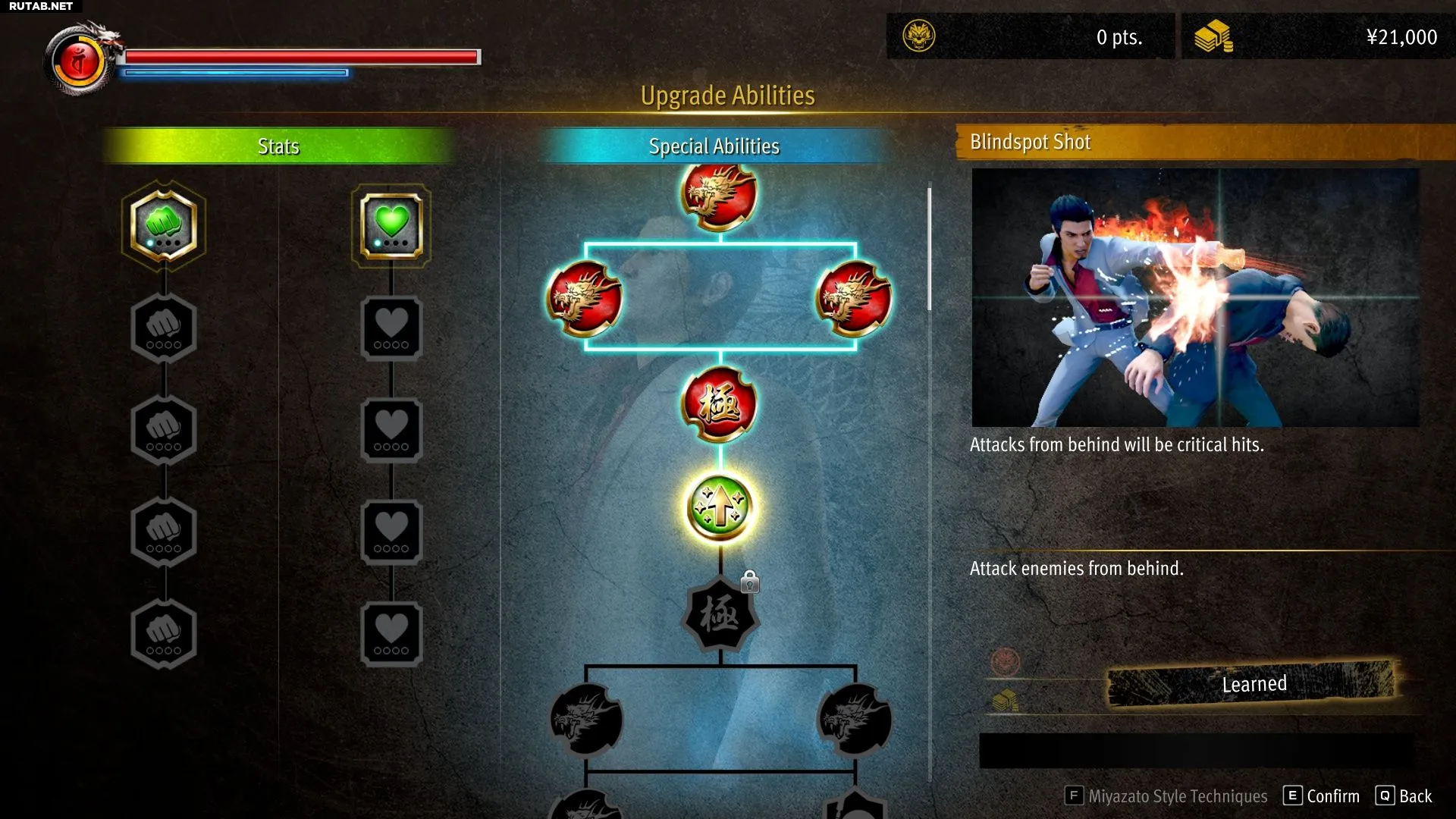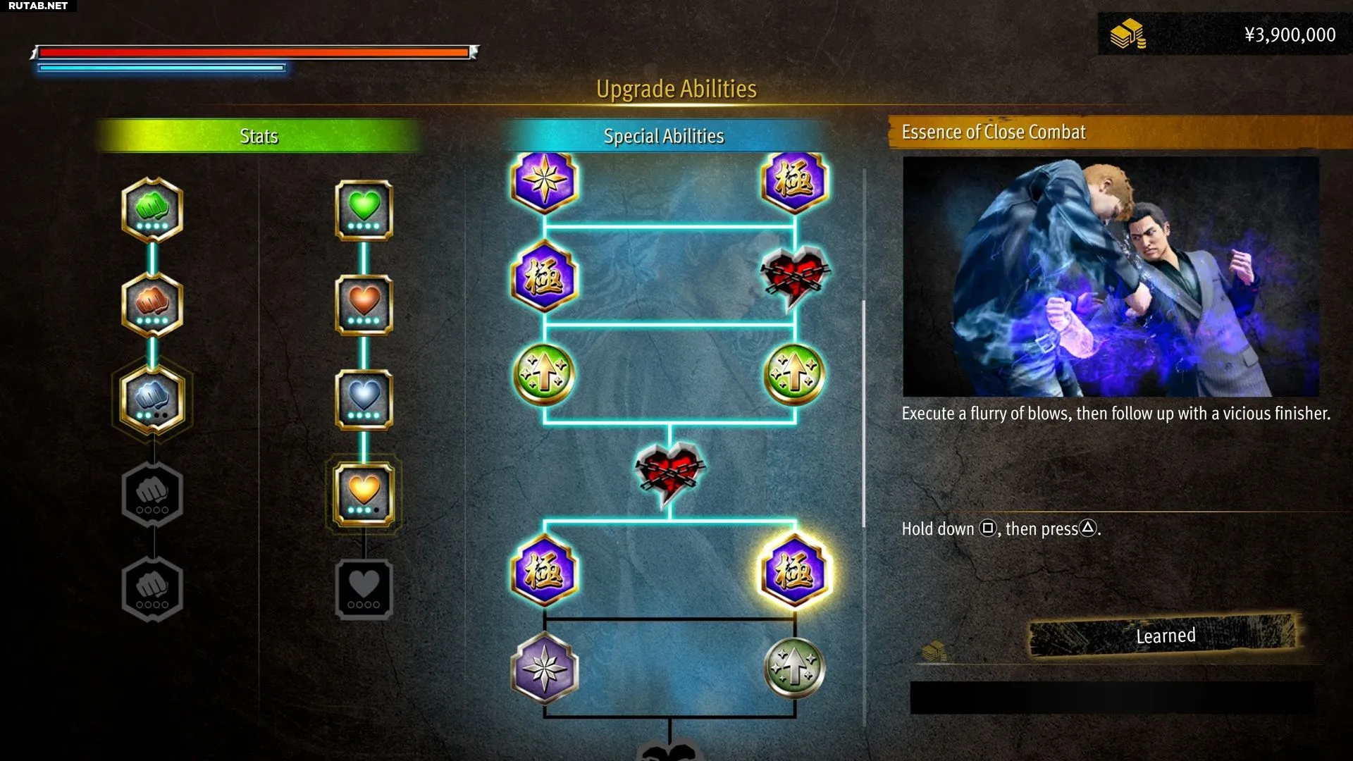 С первых глав за Кадзуму Кирю и Ёситаку Мине вы можете тратить иены на прокачку их соответствующих веток навыков здоровья. Каждая ветка состоит из 5 узлов, каждый из которых нужно улучшить 4 раза, прежде чем переходить к следующему.