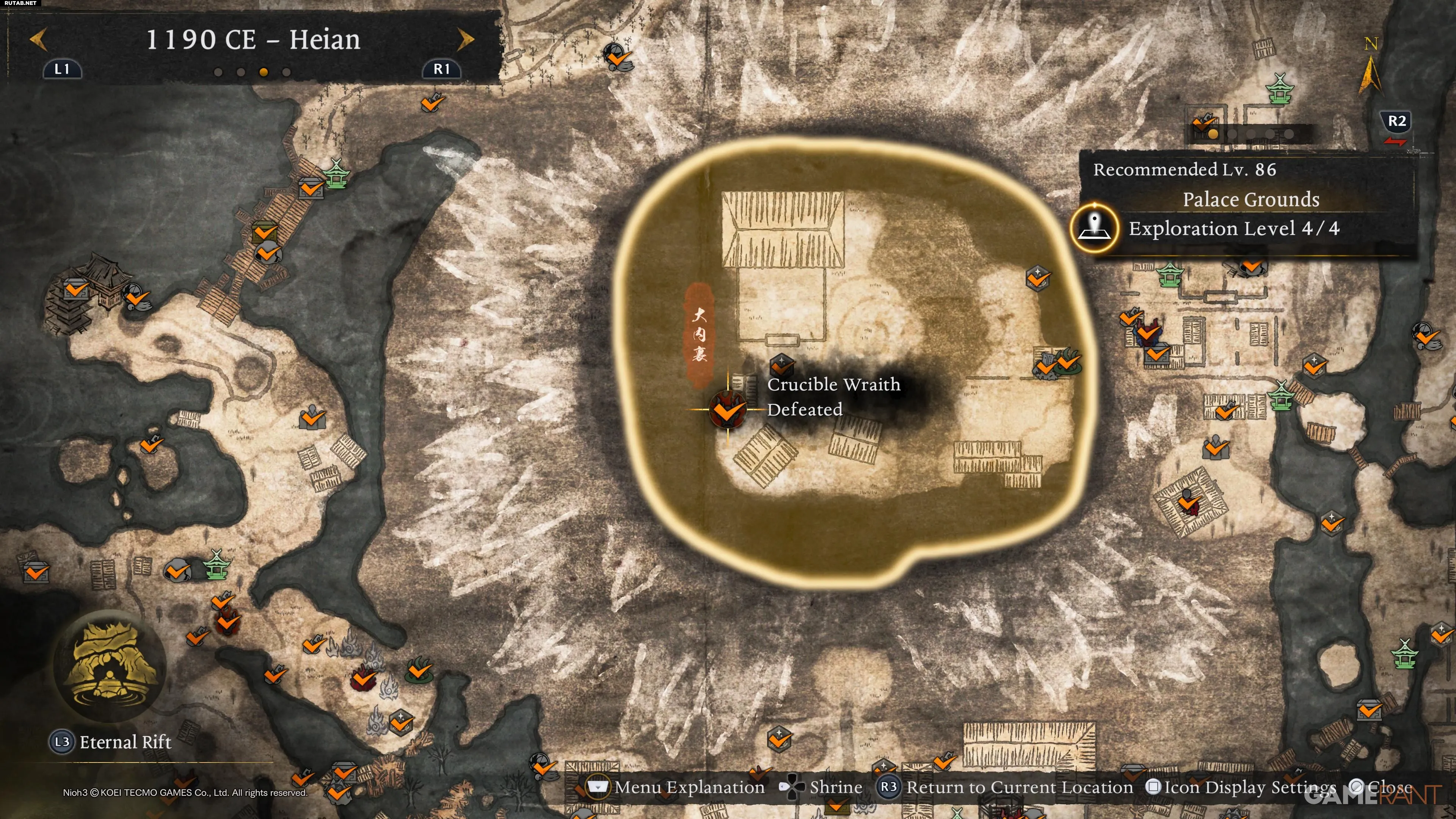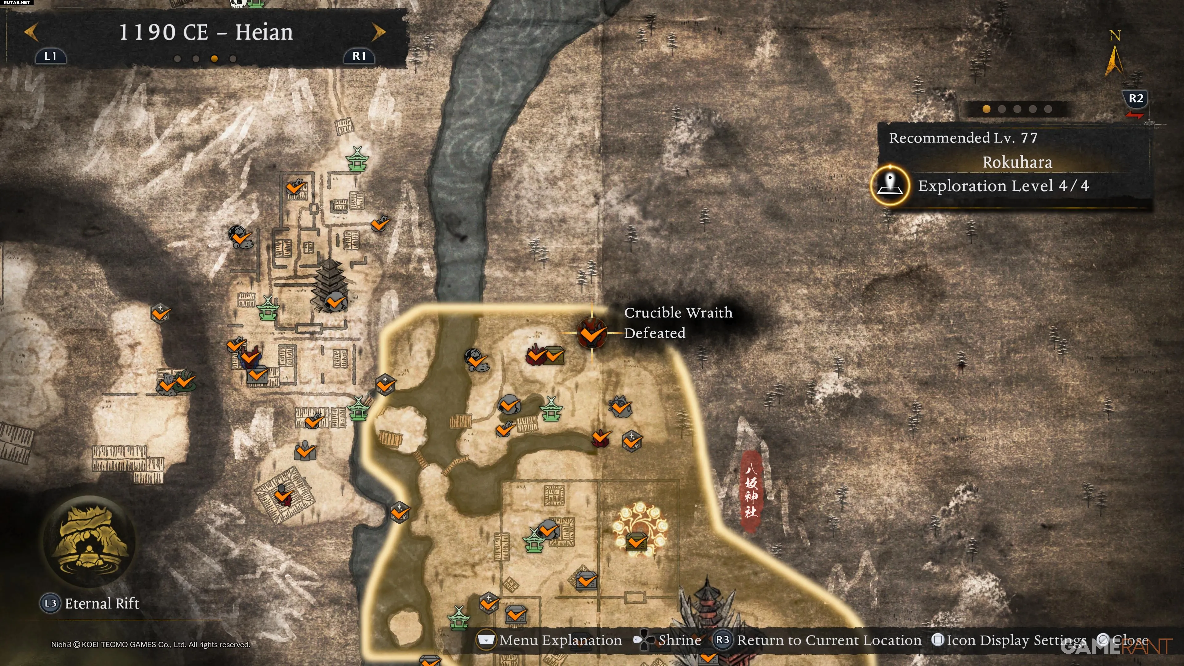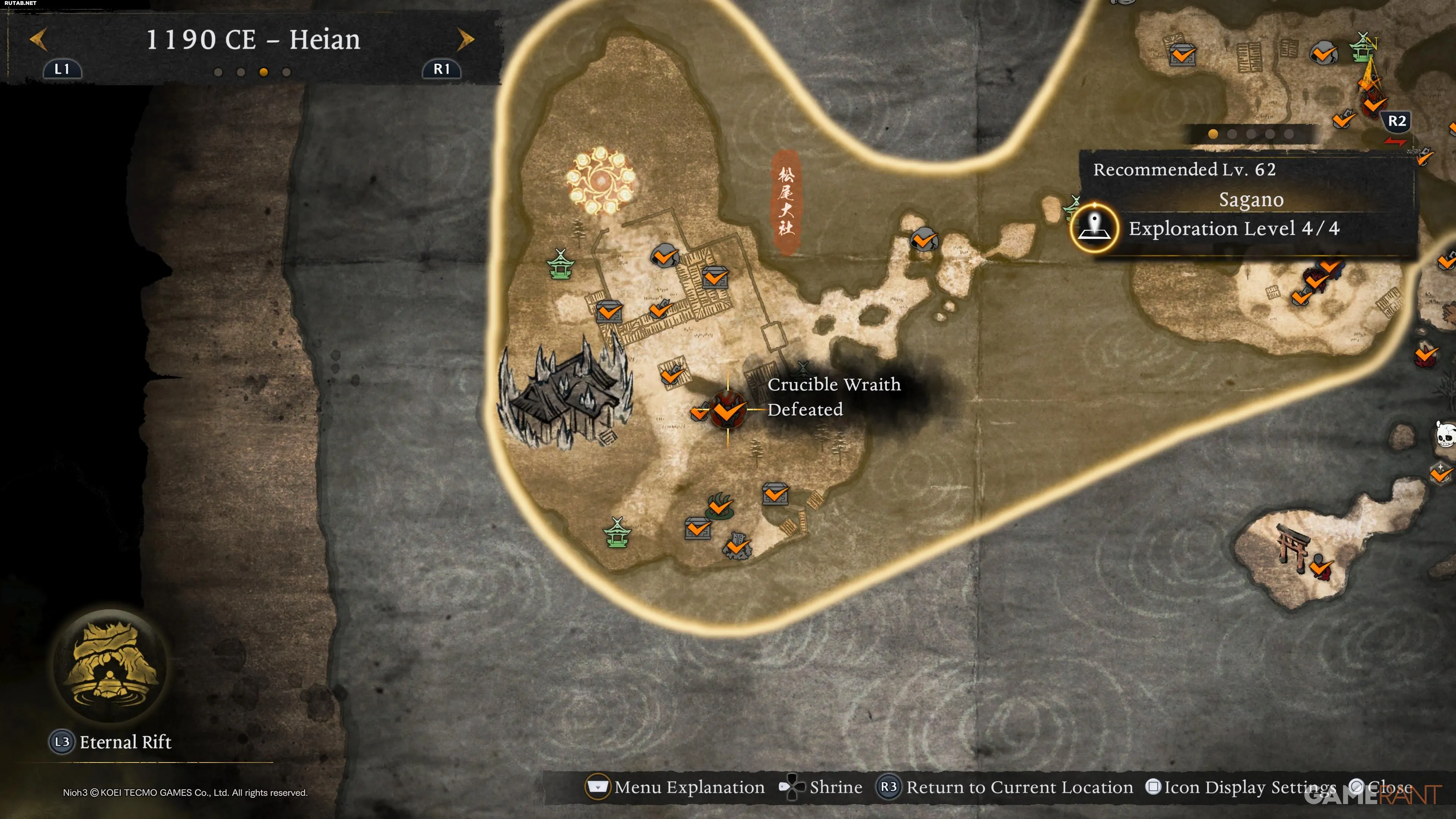 После повышения уровня исследования региона они отмечаются на карте, но не требуются для получения трофеев. В эпохе Хэйан их 8. Ниже приведены все их локации.