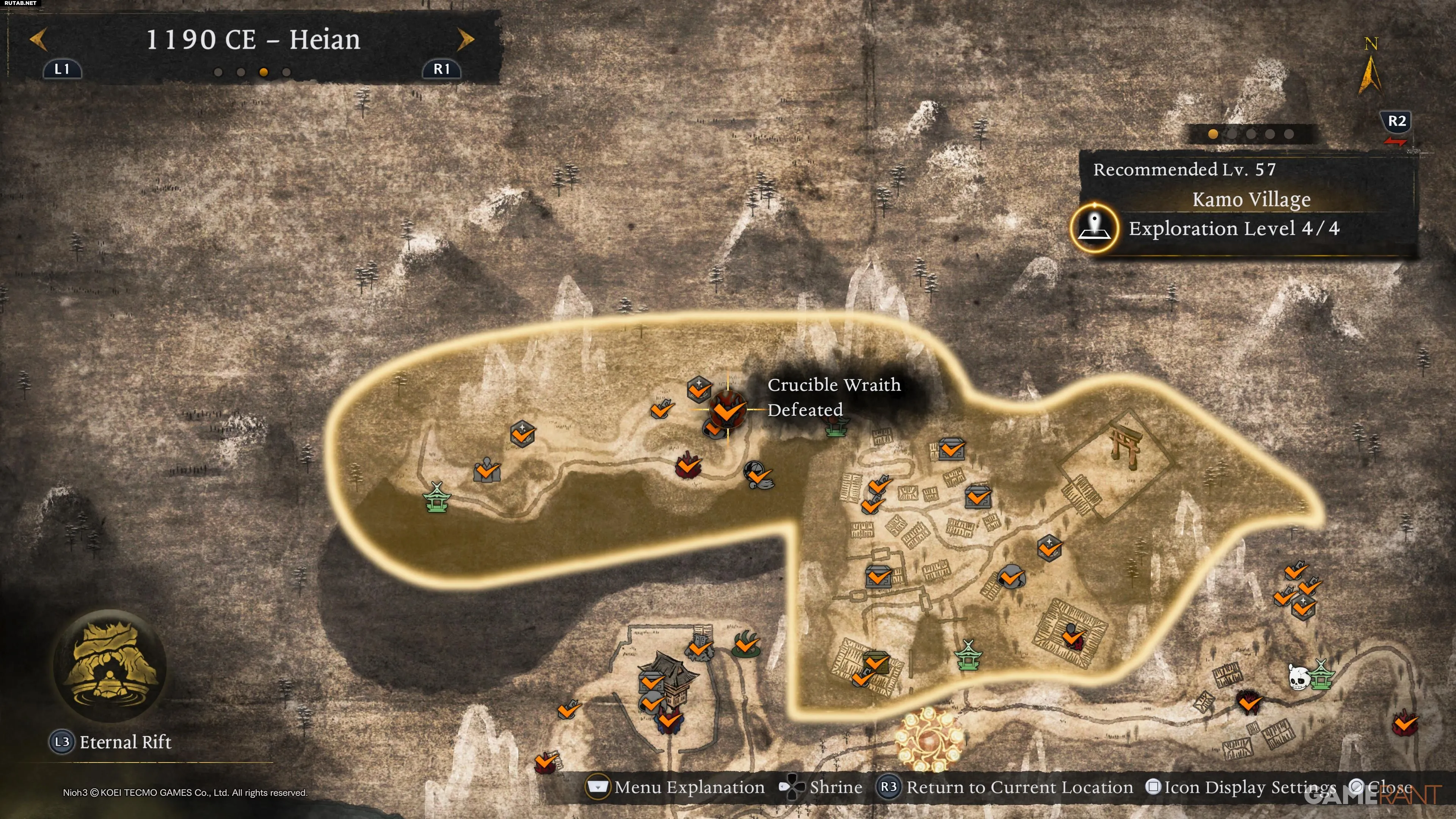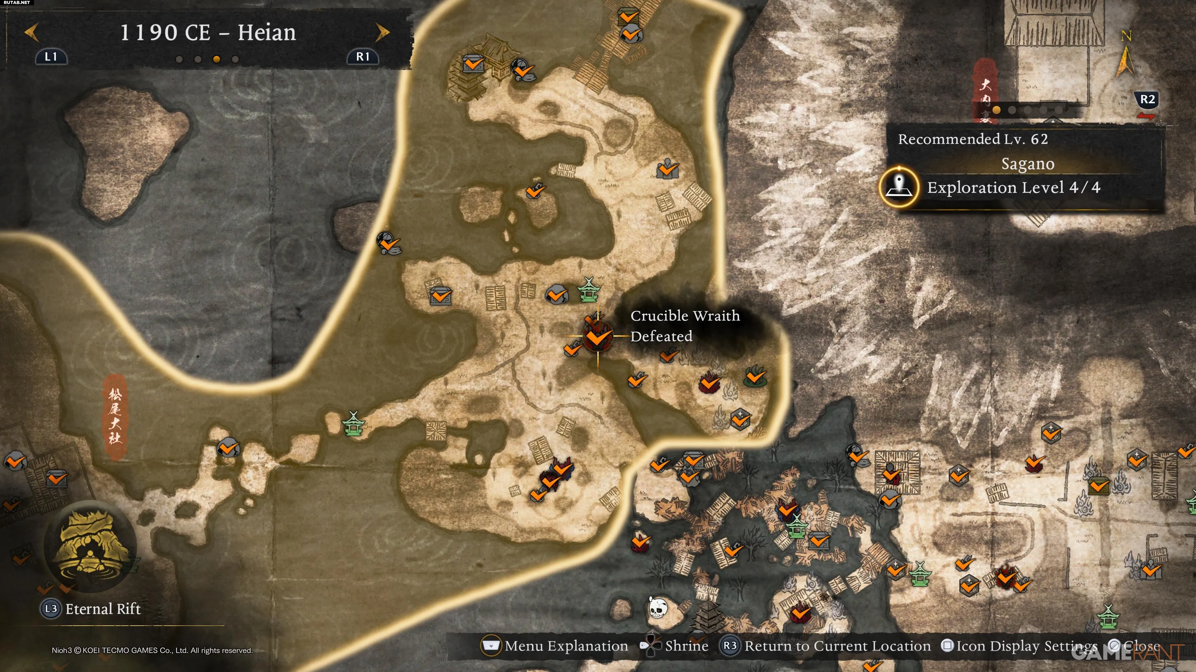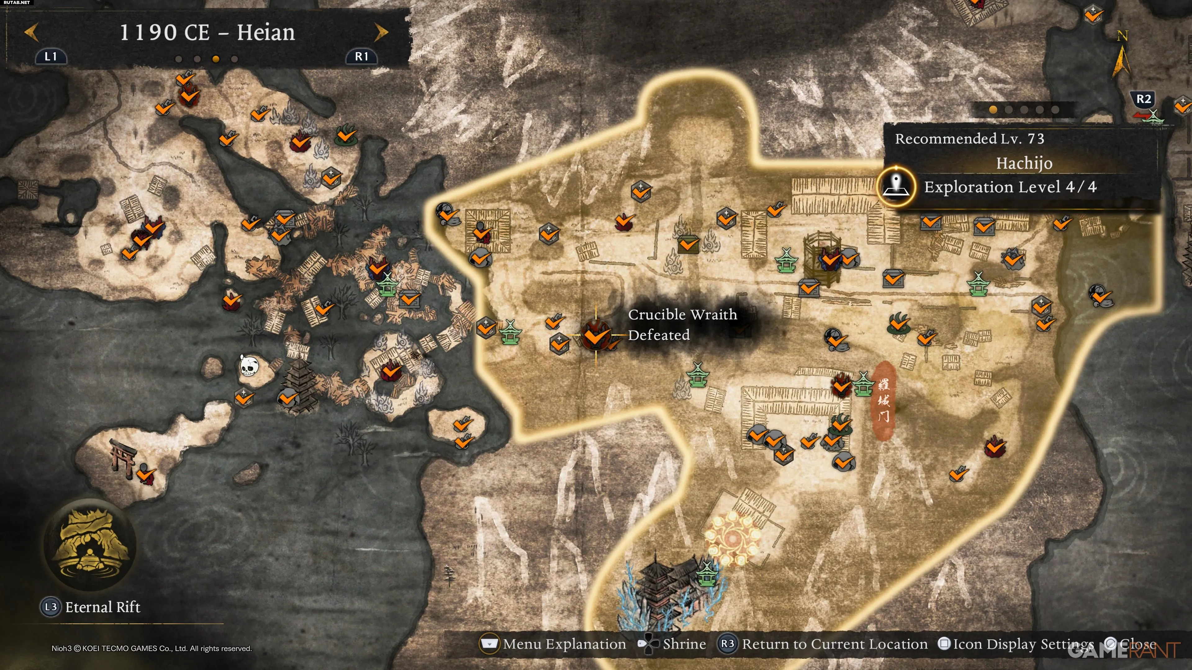 После повышения уровня исследования региона они отмечаются на карте, но не требуются для получения трофеев. В эпохе Хэйан их 8. Ниже приведены все их локации.