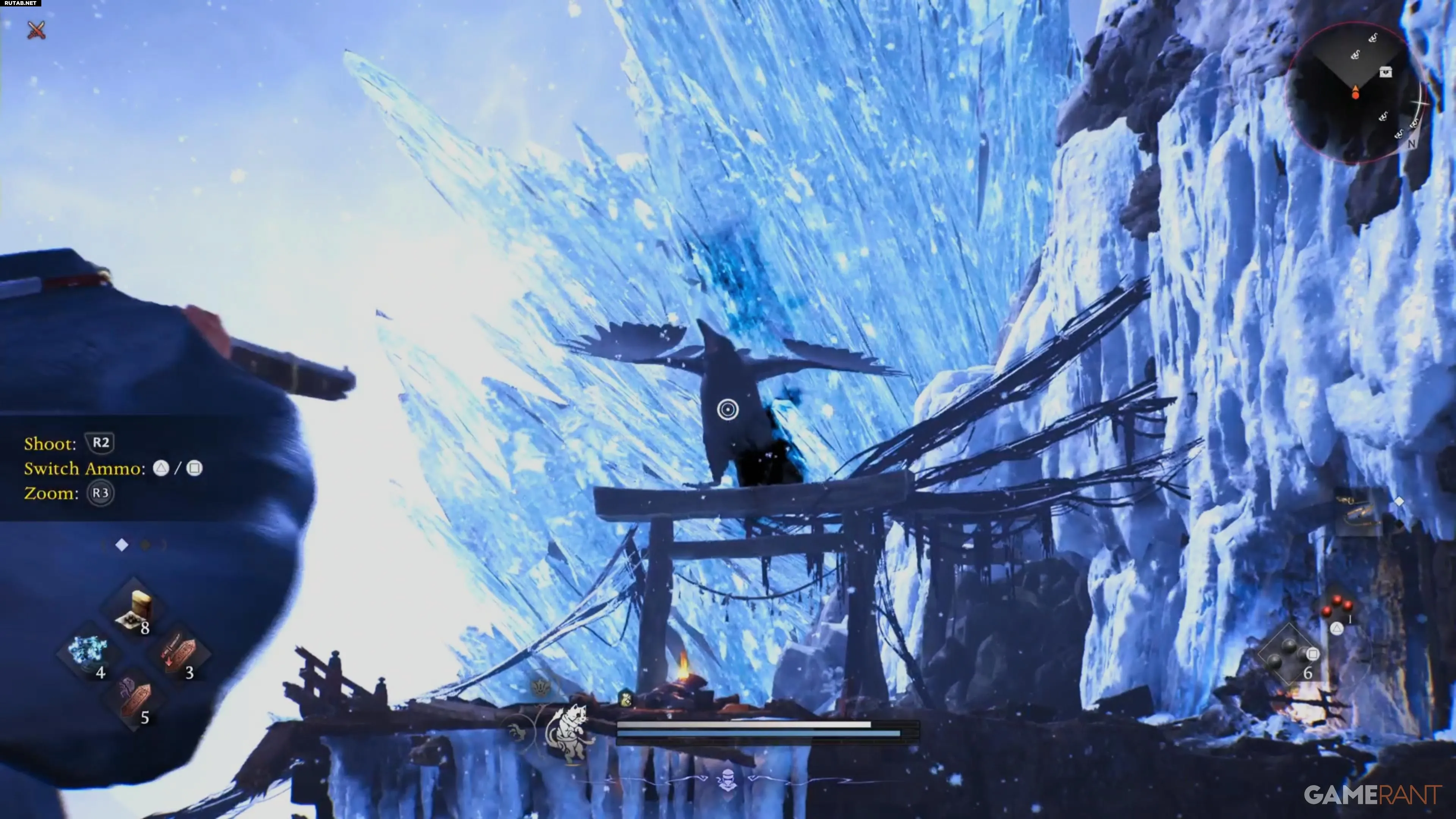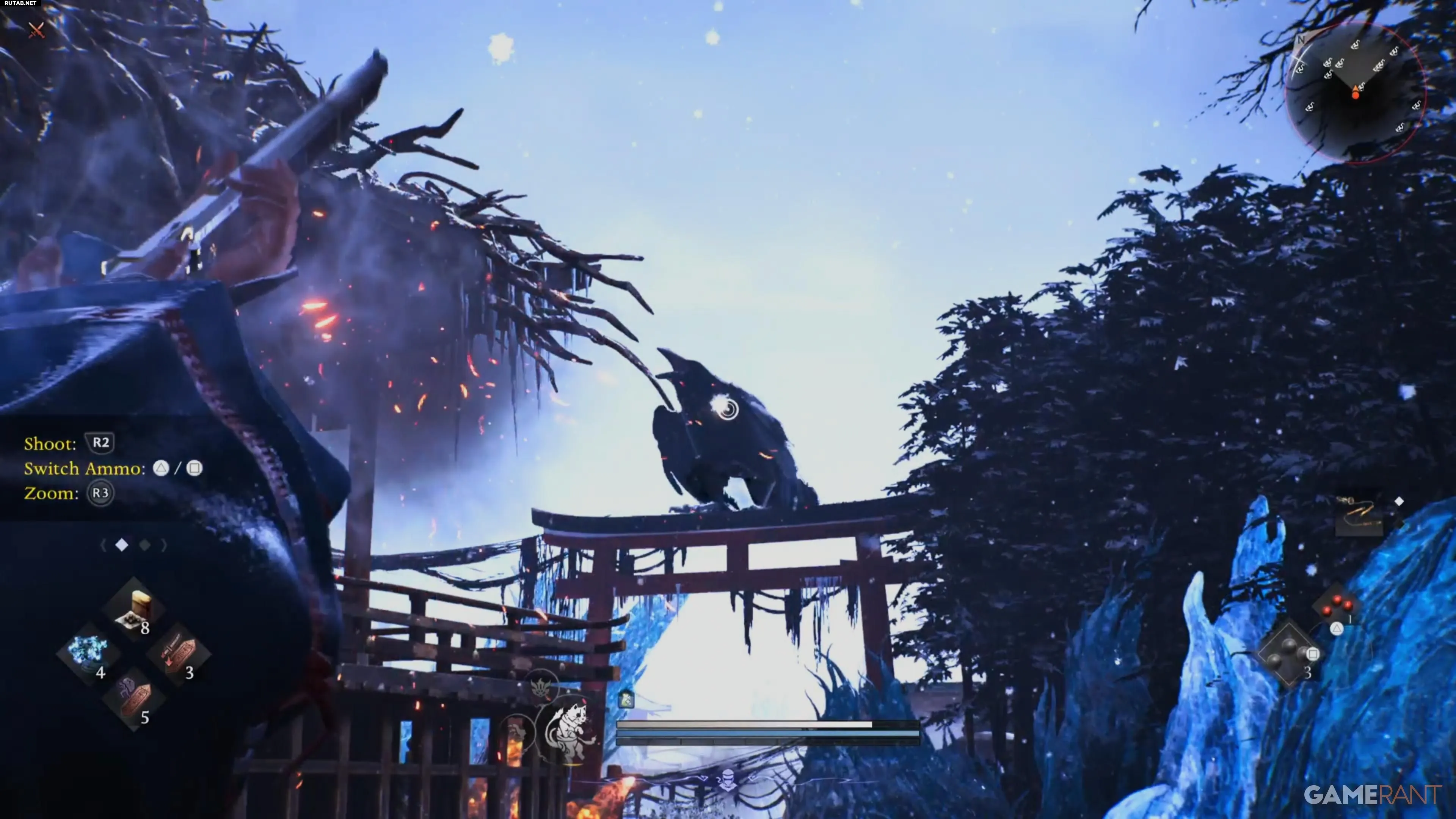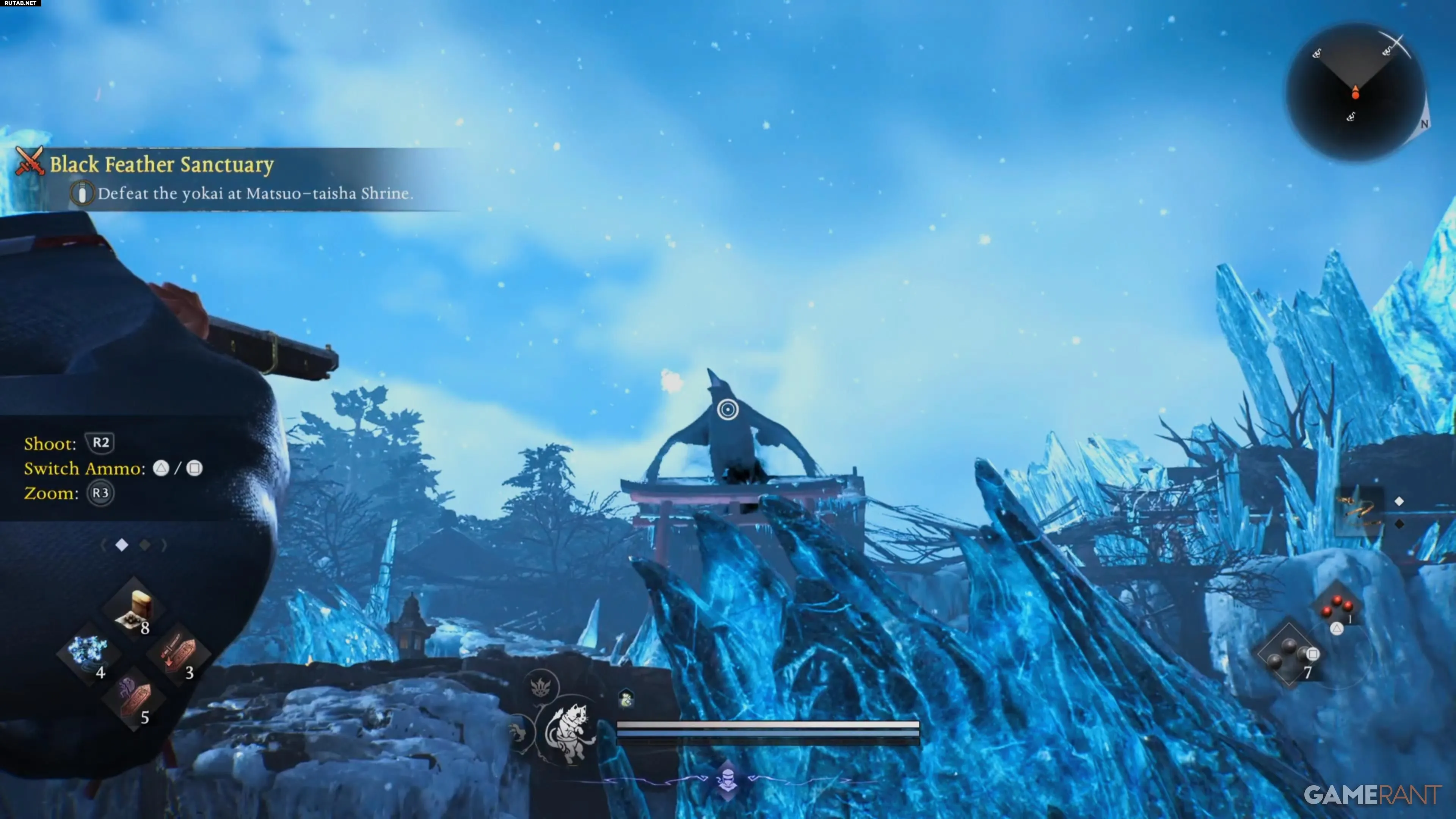 В ходе миссии вы встретите огромного ворона, который будет сидеть на тории и атаковать вас снарядами на расстоянии. Обычно игроки, приблизившись к нему, заставляют птицу улететь. Но для трофея требуется другой подход.