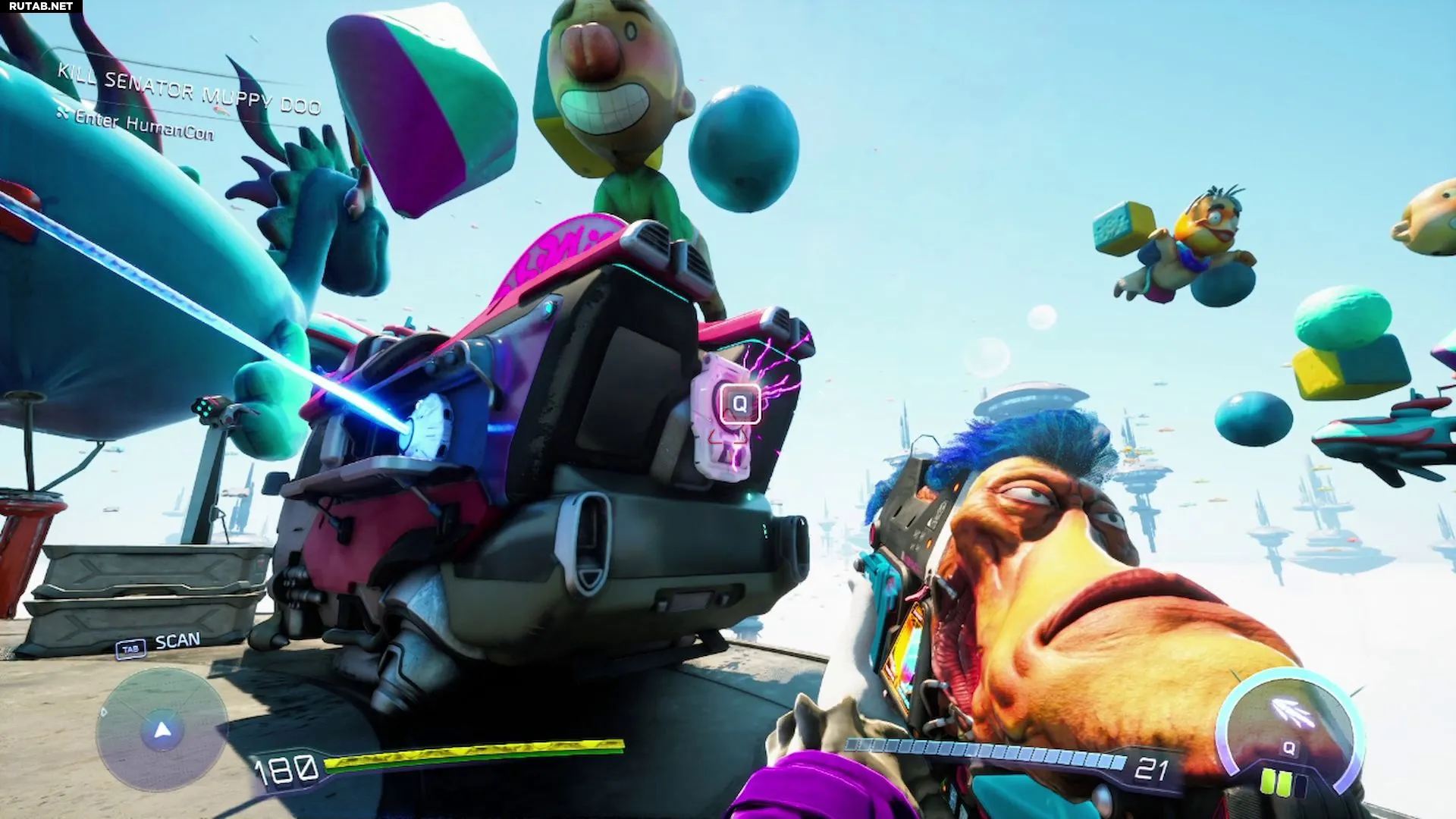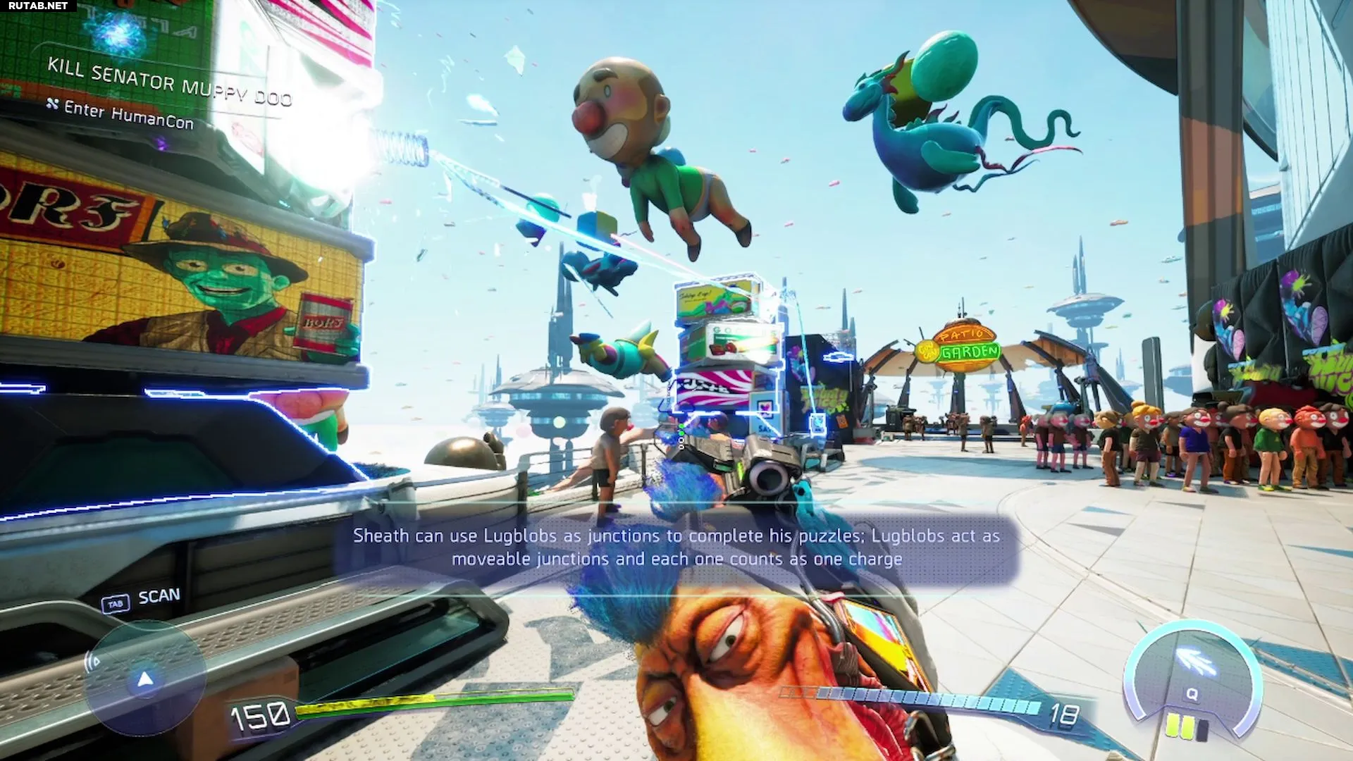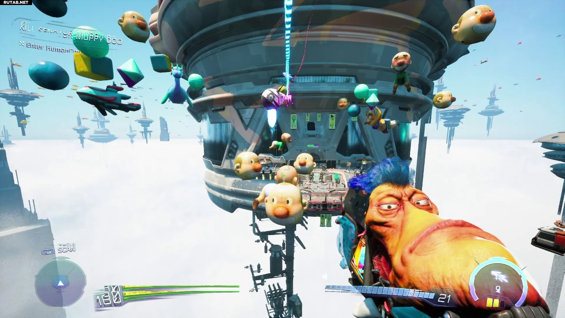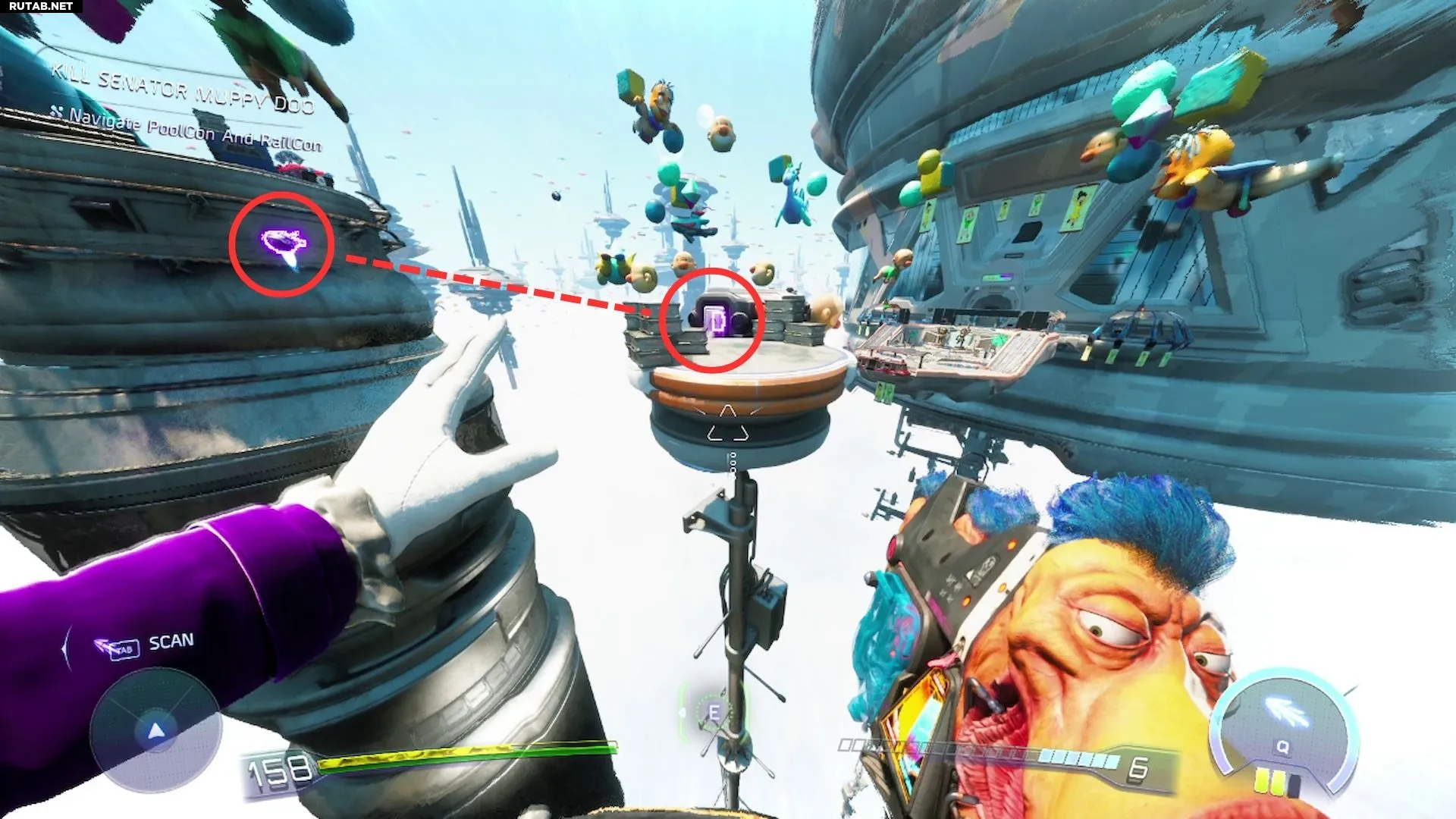 Посмотрите в сторону плавающих шаров-голов и найдите плавающий приемник. Забросьте «Шип» к этому приемнику, чтобы создать zip-линию. Используйте ее, чтобы добраться до шаров, а затем примените их как трамплины, чтобы достигнуть HumanCon.