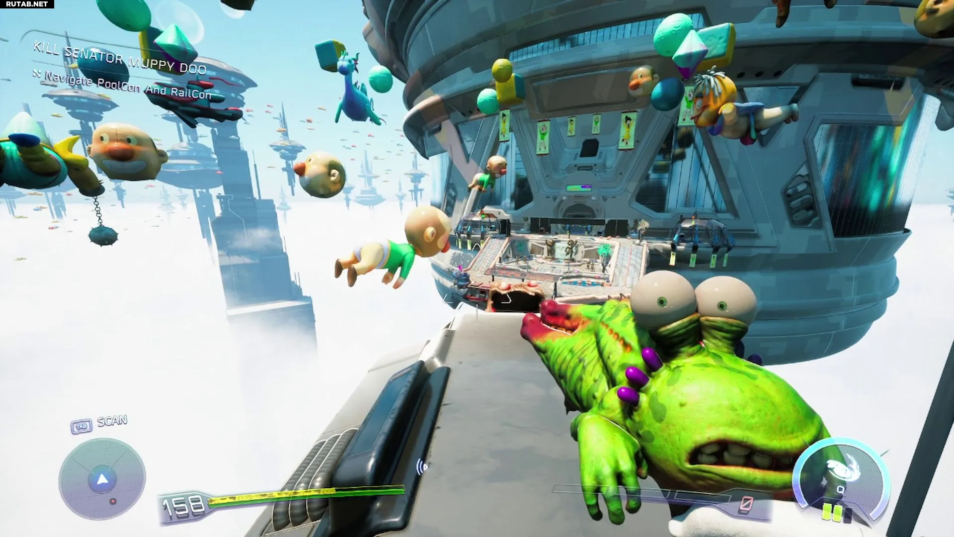 Спрыгните с перила рядом с воздушным шаром в виде человеческой головы и используйте его как трамплин, чтобы запрыгнуть на плоскую вершину платформы. Уничтожьте пришельцев, стреляющих с соседних маленьких платформ.