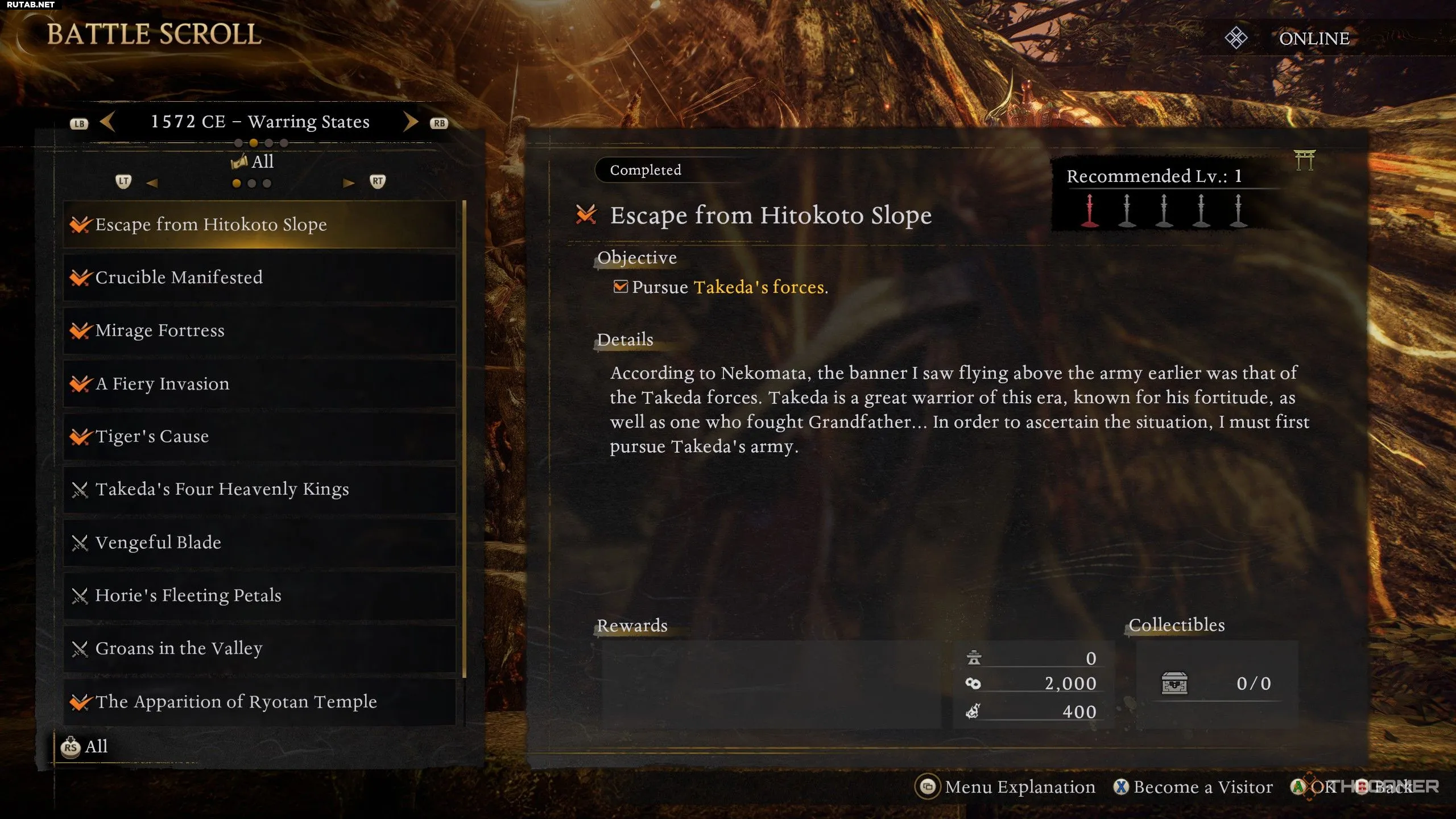 | The Old Tiger Departs | Destroyed the Crucinite harbored within Takeda Shingen's Guardian Spirit | Story Related |