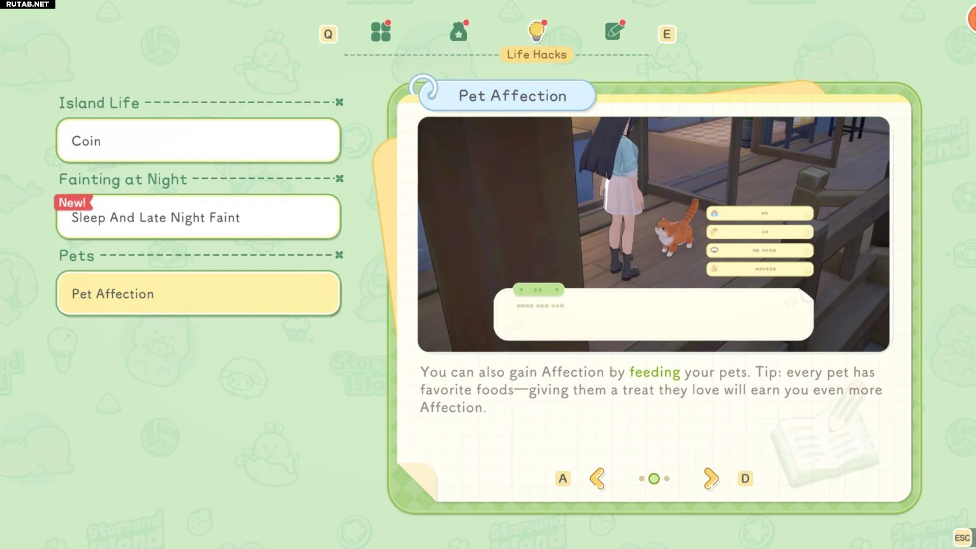 На Острове Звёздного песка игроки могут подружиться с 12 животными. Большинство из них — кошки и собаки, но у вас также будет шанс завоевать доверие белки, капибары, панды и даже прекрасной розовой лисы. Имена и виды животных следующие: