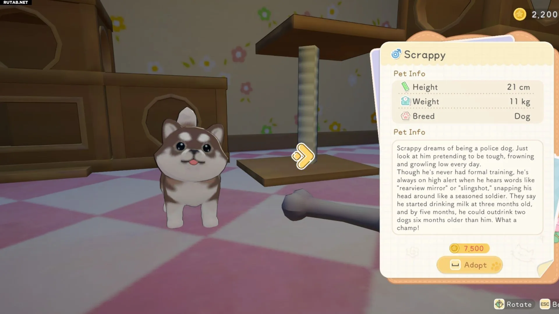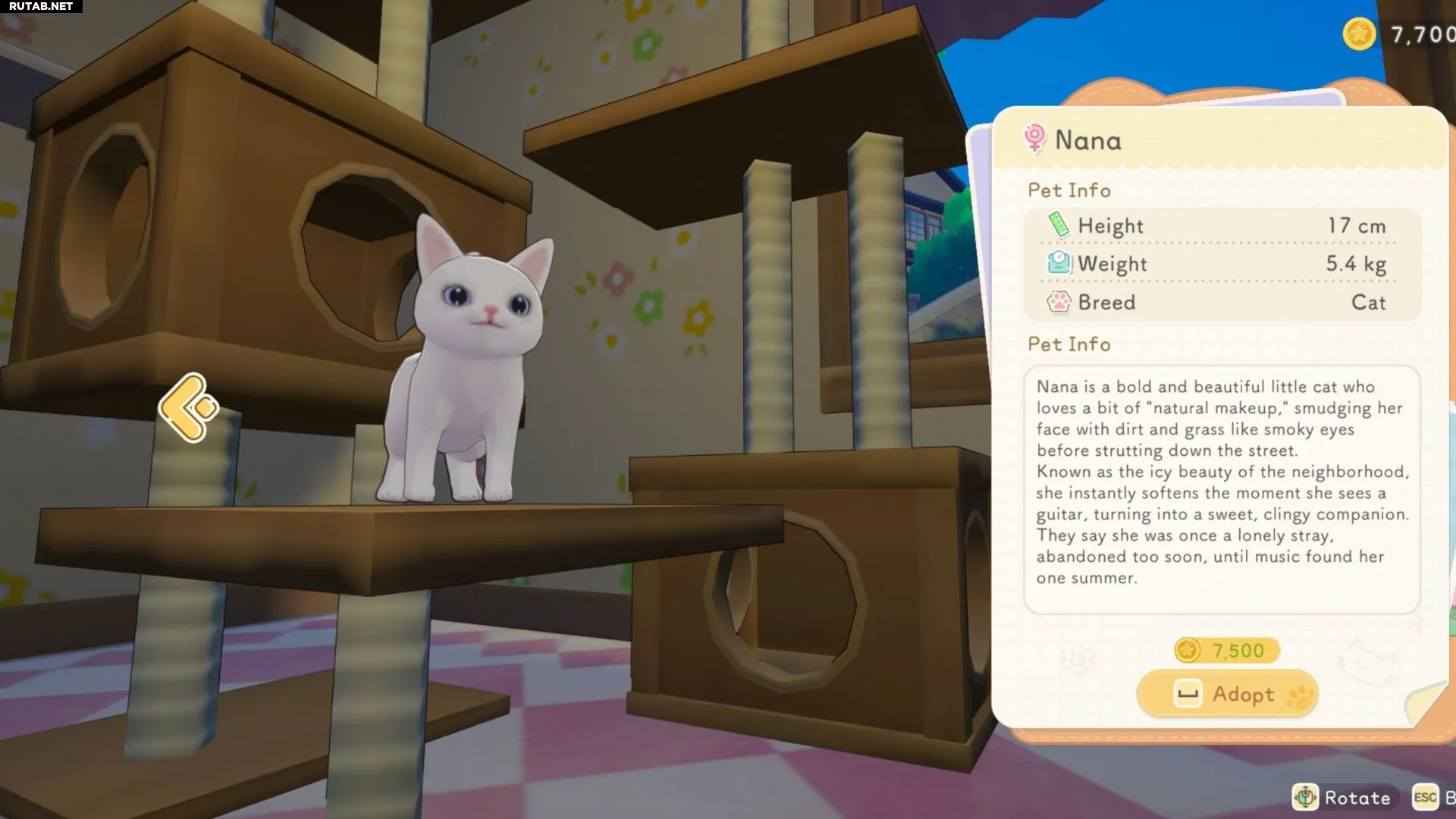 Два питомца, доступных для усыновления в этом магазине — это щенок Скрэппи и белый котёнок Нана. Чтобы их усыновить, нужно взаимодействовать с кассой у стойки и выбрать опцию усыновления. Каждый питомец стоит 7500 монет, поэтому убедитесь, что у вас достаточно средств.