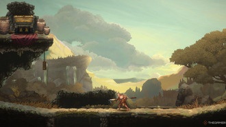 В этой верхней зоне потяните рычаг, а затем снова используйте Ликурга на каменном глазе. Это позволит вам спрыгнуть на другую движущуюся платформу. Когда она окажется в верхней точке своего цикла, прыгните вправо и используйте Вечное Пламя, чтобы сжечь шипы на потолке над вами. Это откроет ещё одну цель для Солнечной Пращи. Попадание в неё активирует движущуюся платформу справа. Прежде чем подняться на ней, нужно потянуть ближайший рычаг. После этого вы сможете добраться до финиша, где ждёт сундук с двумя единицами Необработанной Руды.