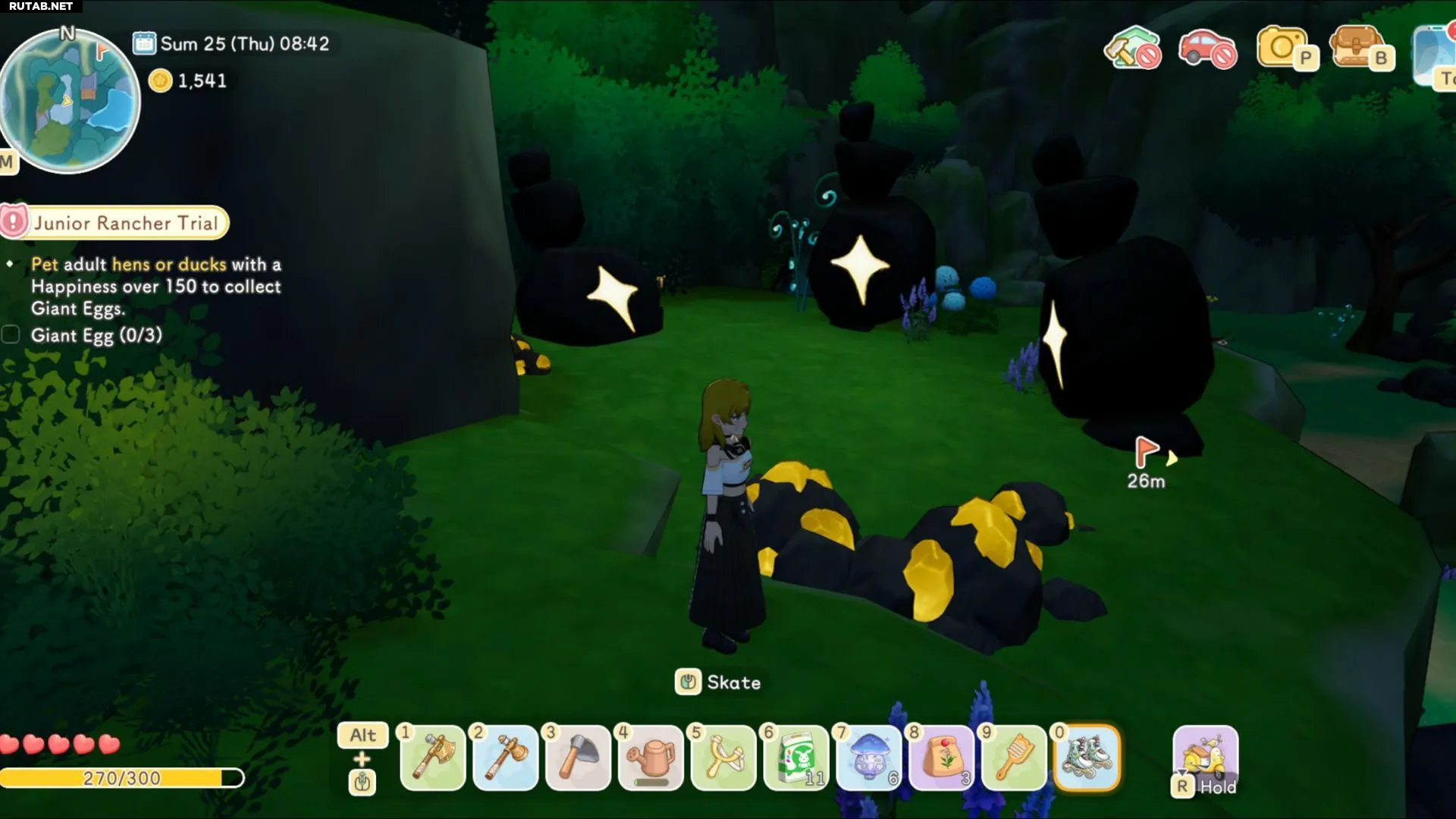 Наверху вас ждёт бревенчатый мост. Перейдите через него и поверните налево, чтобы увидеть три высоких камня, стоящих рядом. Вокруг этих камней будут разбросаны золотоносные породы.