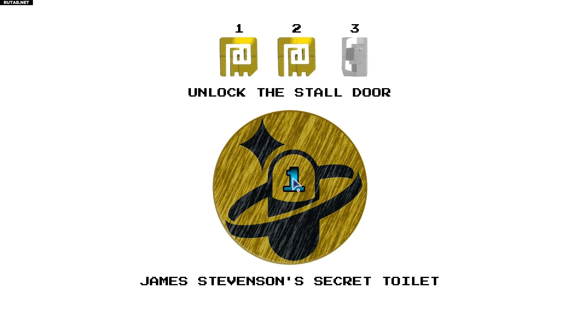 Первый портал — большая картина с зеленым инопланетным королем на троне, расположенная на стене напротив книжного шкафа. Прыгните в неё. Вас встретит экран с подсказкой «Отпереть дверь кабинки», чтобы попасть в «Секретный туалет Джеймса Стивенсона».