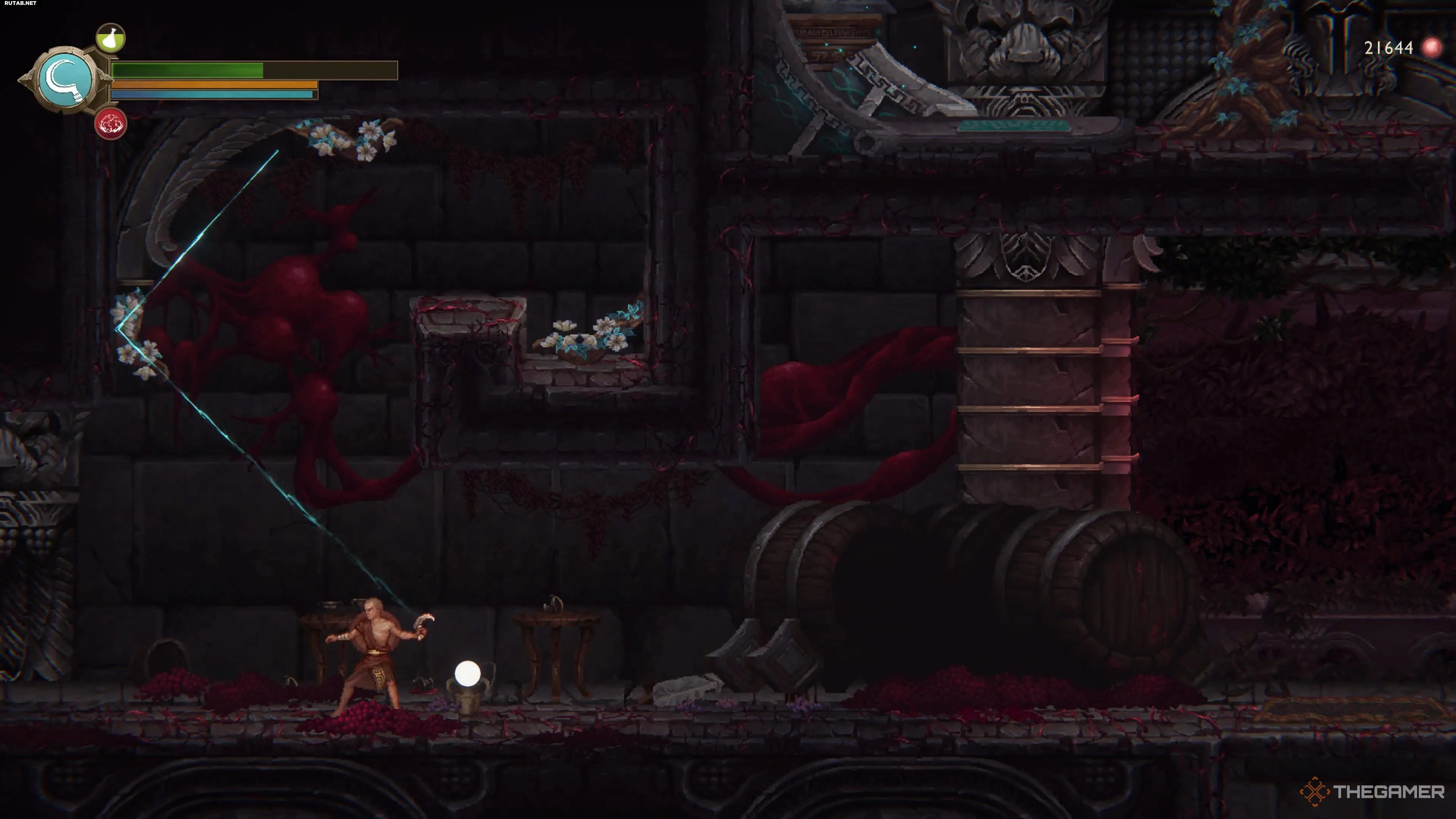 Чтобы это сделать, дождитесь, пока получите Серп Жатвы, и вернитесь в Виноградник Онея при первой же возможности. Направляйтесь в главный зал, где вы впервые сражались с Аластором, и идите на северо-запад по той же тропе, что вела к кровавому фонтану.