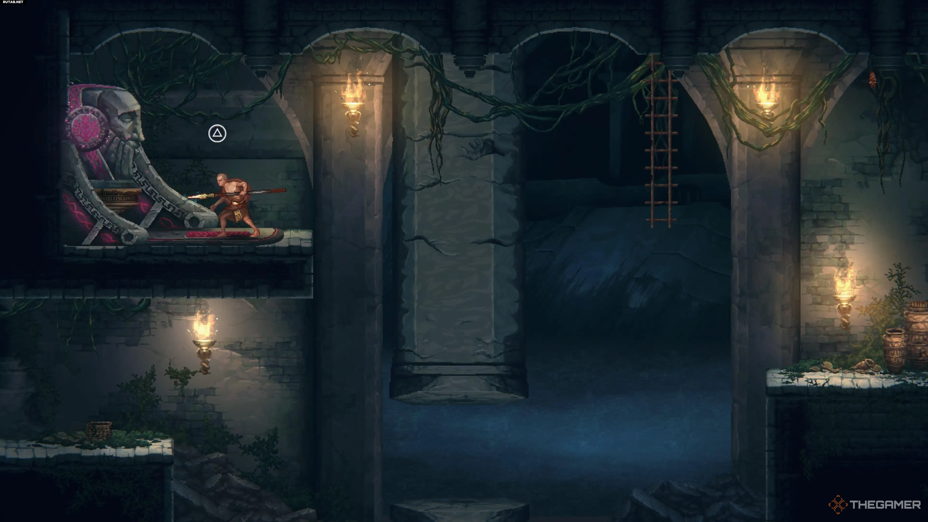 В конце комнаты, используя двойной прыжок с лестницы, запрыгните на приподнятую платформу в левом верхнем углу. Взаимодействуйте со статуей, чтобы она сбросила Вечное Огниво. Теперь просто поднимите предмет, удерживая кнопку Triangle, и отнесите его в Храм Гестии.