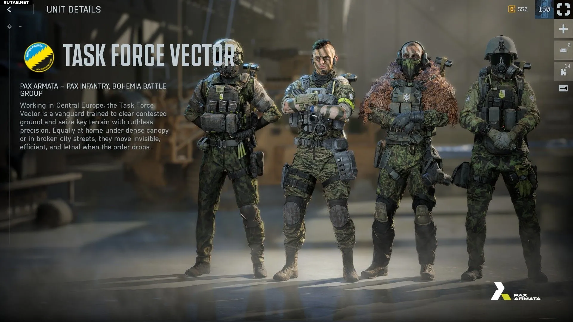 Ударное подразделение «Вектор» — это авангардный отряд Pax Armata, дислоцированный в Центральной Европе. Они специализируются на боях в городской и лесной местности, их камуфляж выполнен в зеленых тонах с листвой и подчеркнут фирменными желто-салатовыми полосами Pax Armata.