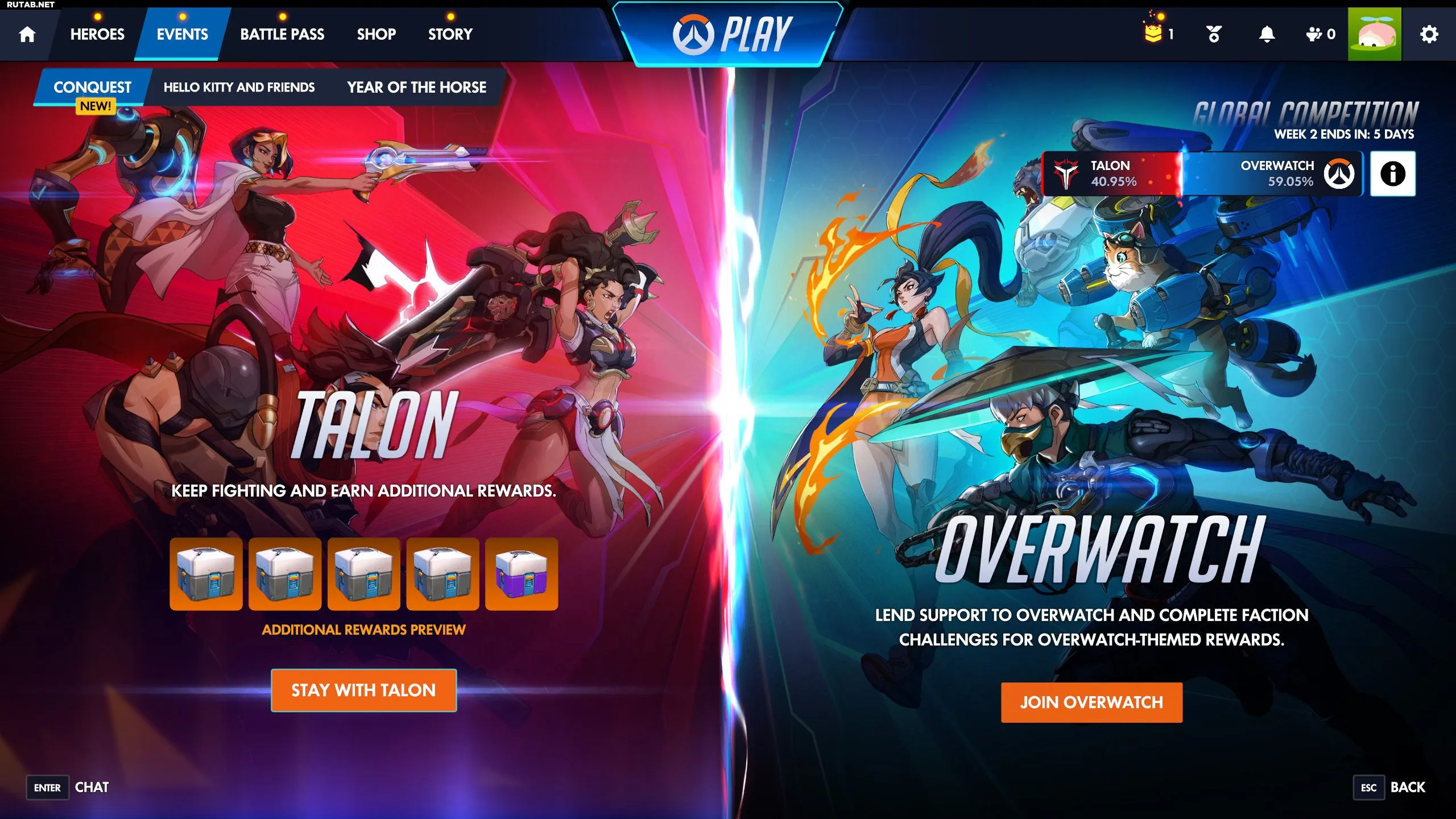 Событие «Талон против Overwatch» длится пять недель. Игроки выбирают одну из двух фракций и выполняют ежедневные и еженедельные задания, зарабатывая очки известности (Notoriety Points). За эти очки открываются награды в так называемом «фракционном пропуске» — это набор иконок, реплик и брелоков для оружия.