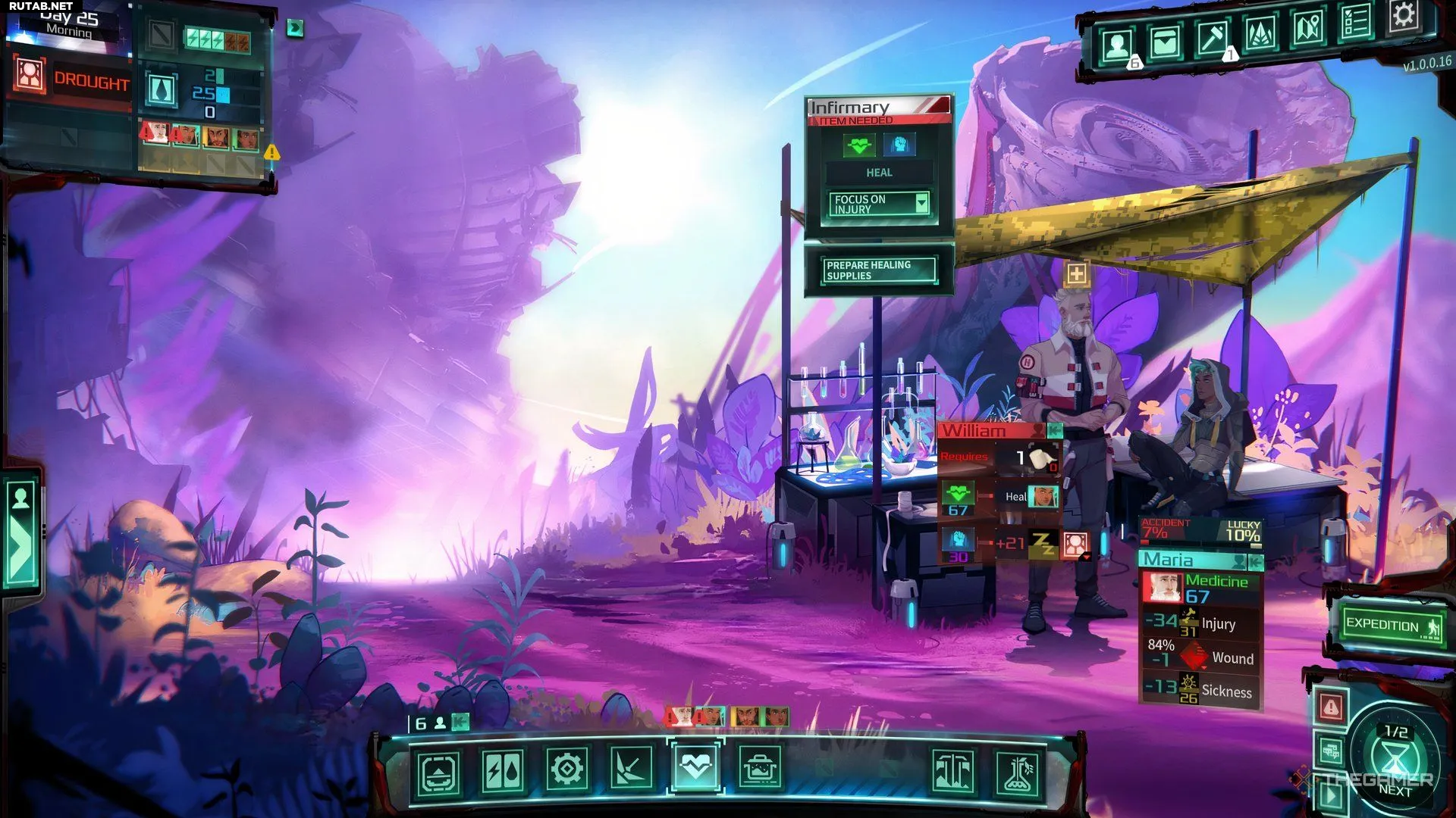 Как и в случае с болезнью, травмы лечатся с помощью лечебных предметов, созданных в Кузнице или Лазарете. В Лазарете Уильям может лечить травмы члена экипажа, одновременно немного снижая его усталость и стресс. Лечебные предметы следует использовать экономно, и, честно говоря, ресурсы, вероятно, лучше потратить на создание чего-то, что снижает голод или усталость.