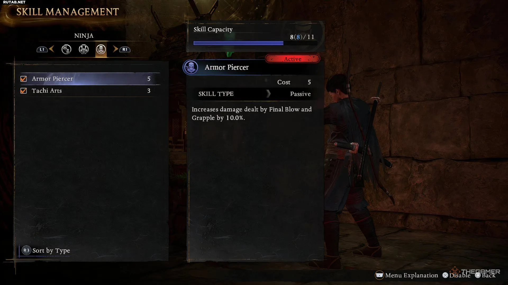 В такой сборке парные ниндзя-мечи работают лучше всего, когда вы сохраняете высокую мобильность, поэтому удержание показателя Ловкости на ранге A или B критически важно. Лёгкие ниндзя-доспехи обеспечивают лучший баланс между выживаемостью и скоростью, позволяя часто уклоняться, не расходуя слишком много Ки.