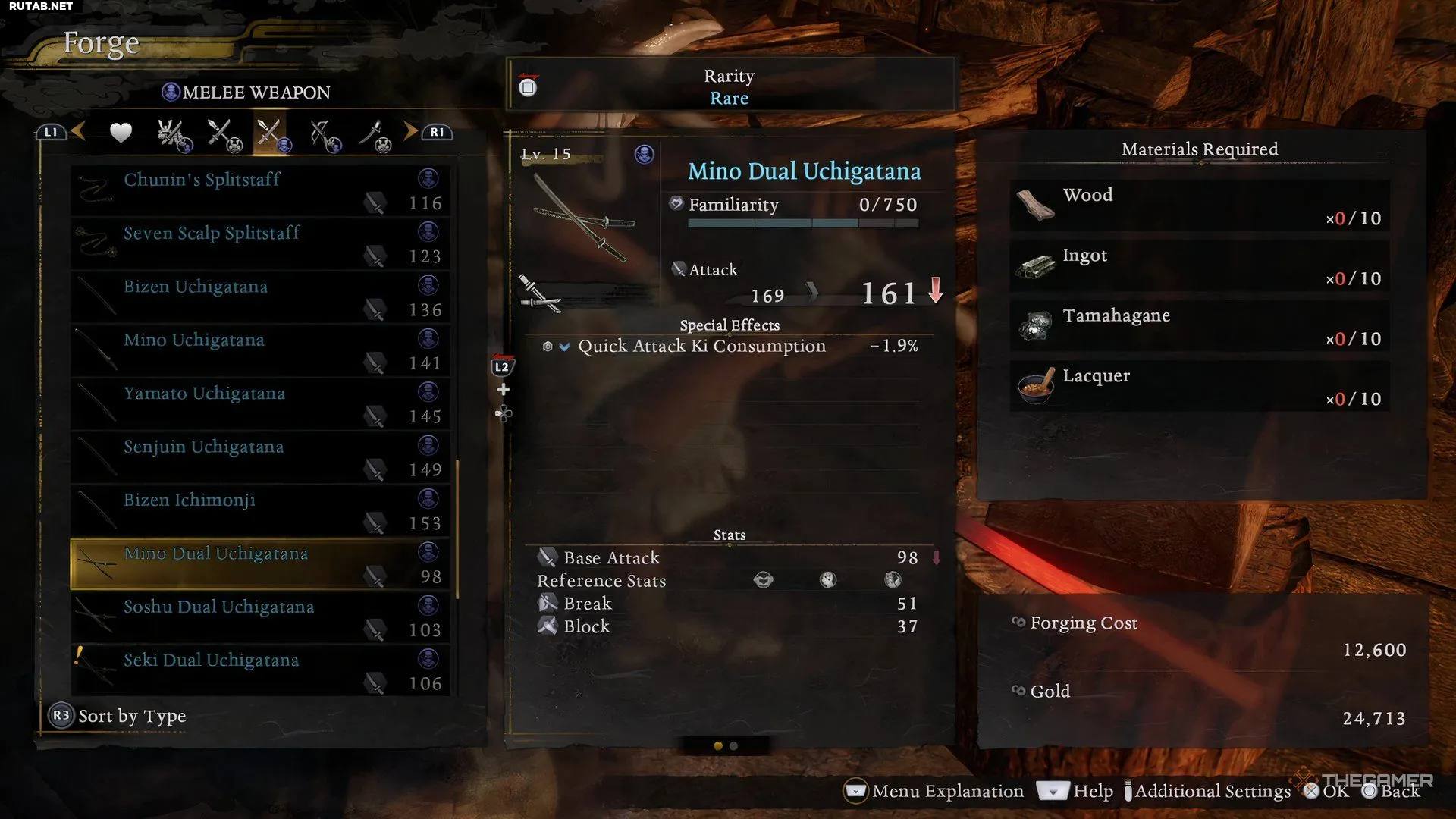 Парные утигатаны Мино можно быстро получить в Nioh 3, выковав их у кузнеца в лисьей маске в Вечной Бездне в обмен на десять единиц каждого из ресурсов: Дерева, Слитка, Тамахаганэ и Лака.