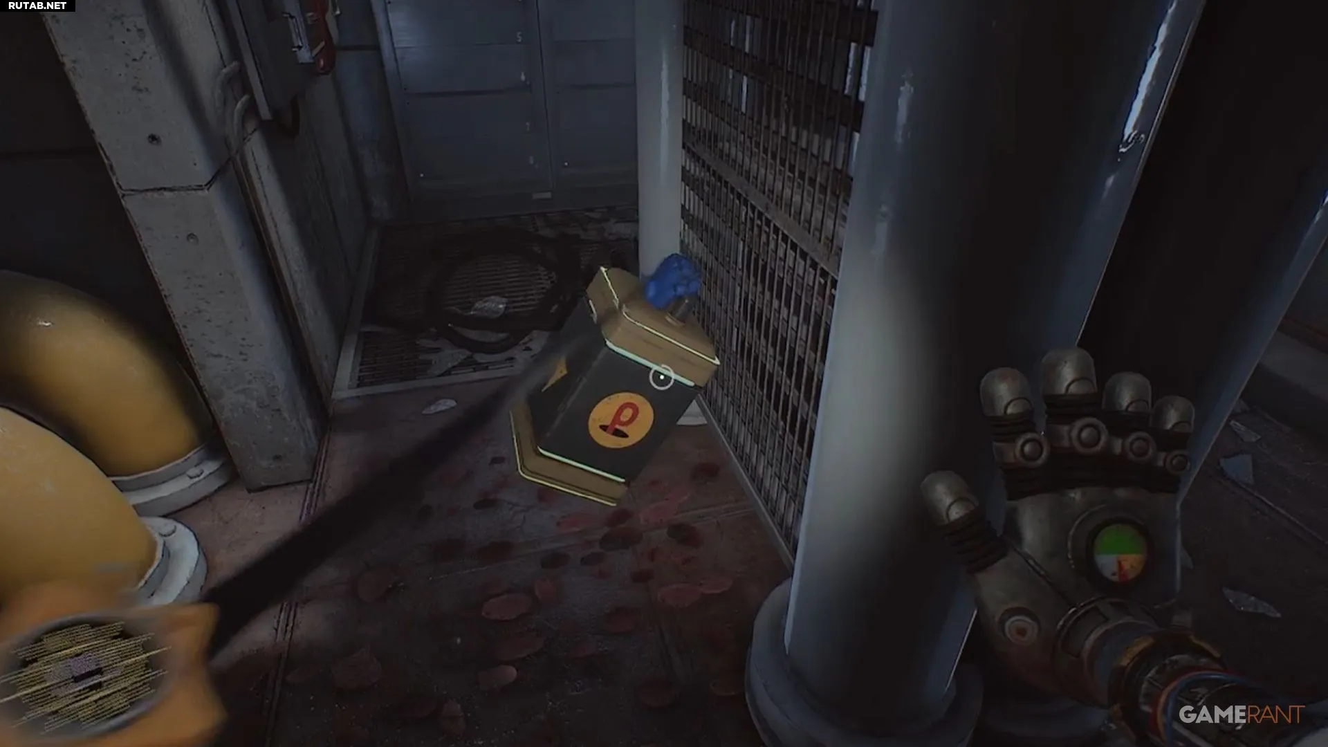 Пройдя комнату с большим деревом и оранжевыми наростами, которые нужно разбить, вы окажетесь в новой зоне. Найдите жёлтую дверь с надписью «Utility» («Коммунальная»). Внутри на полу лежит батарея, которую можно взять. Развернитесь, заберитесь на ящики и найдите панель, которую можно разрушить с помощью «Прессованной» руки.