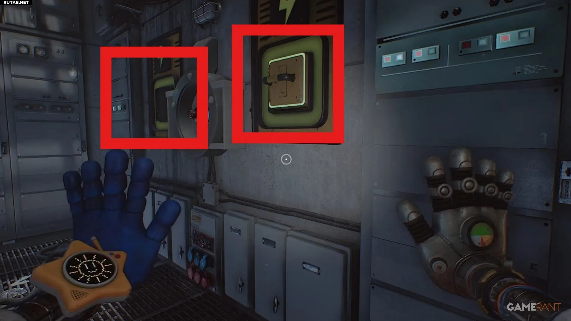 - Теперь выстрелите своей свободной рукой в выключатель. Красная дверь справа откроется, и вы сможете продолжить своё приключение в Poppy Playtime.