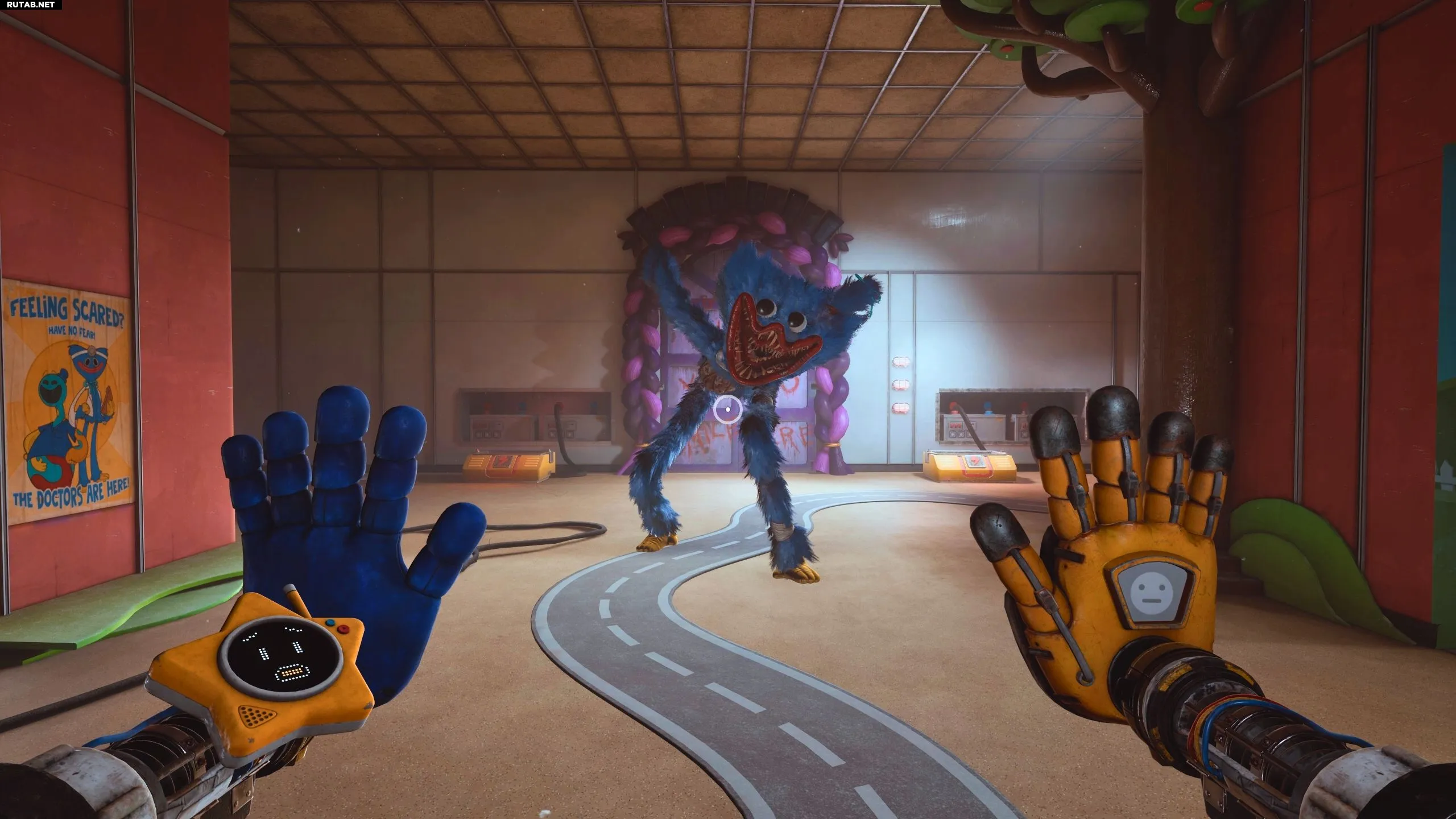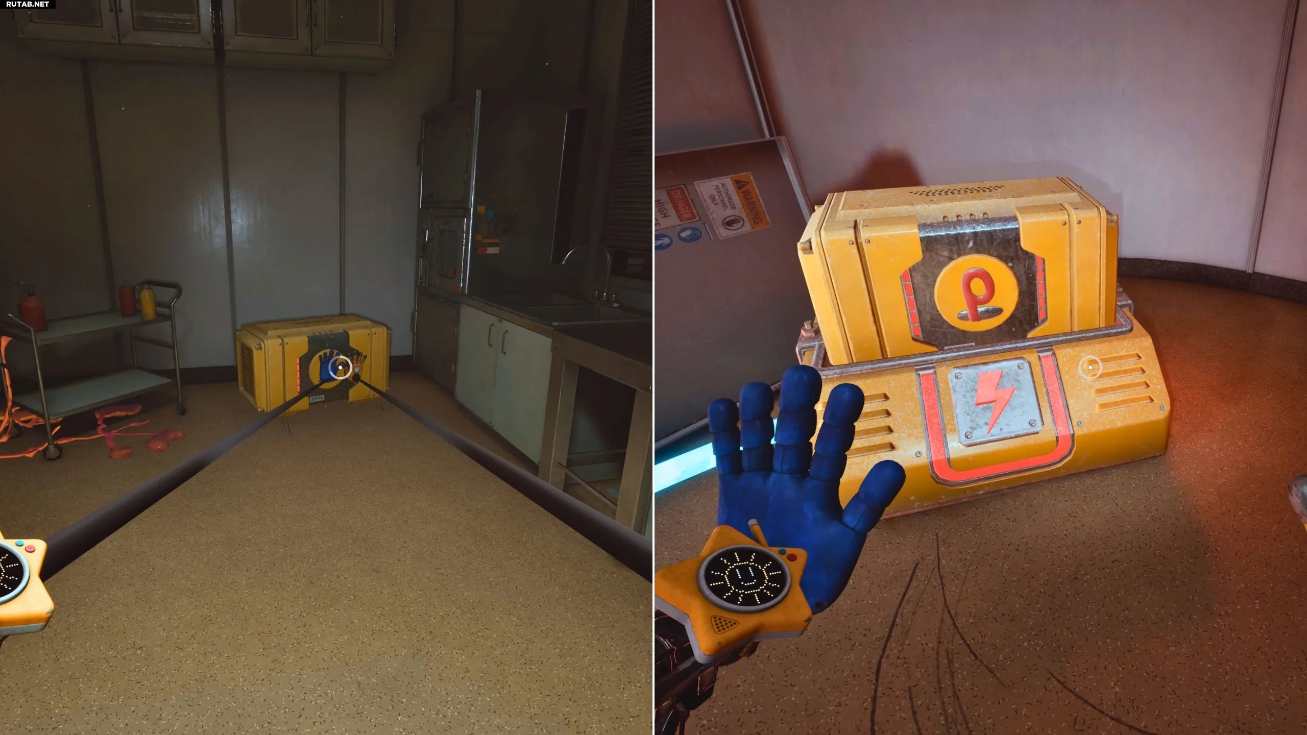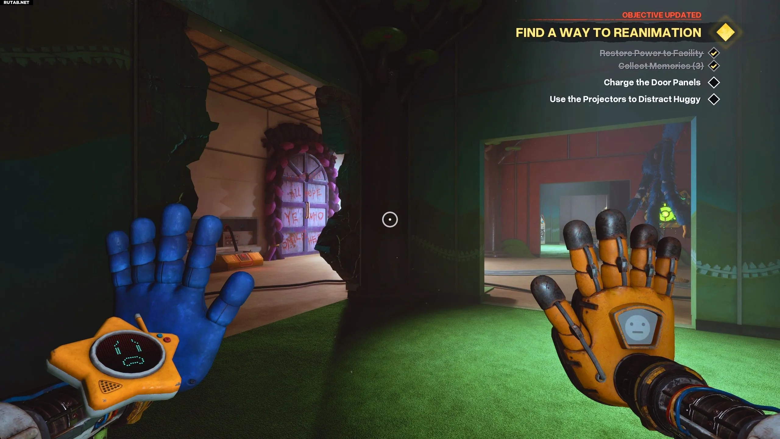Если Хагги Вагги патрулирует территорию, попробуйте зарядить Проводящую руку от электрических щитков в зоне и включить один из проекторов. Это отвлечёт монстра на достаточно долгое время, чтобы вы успели установить батарею в дверную панель.