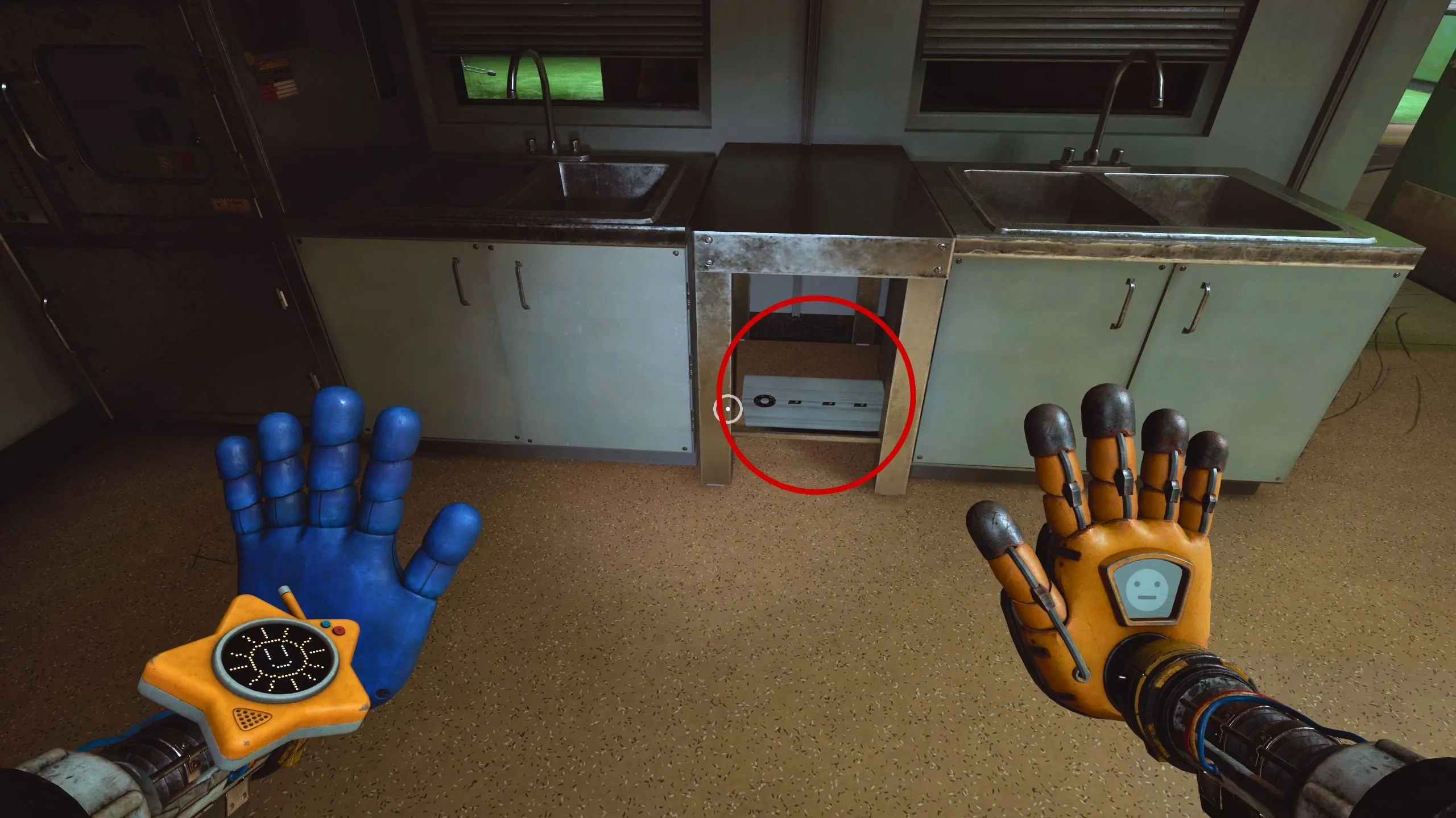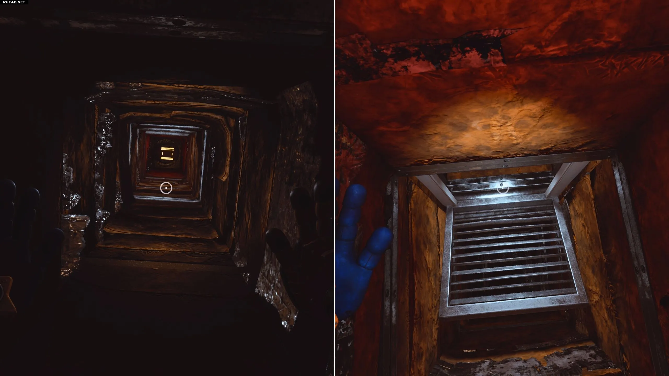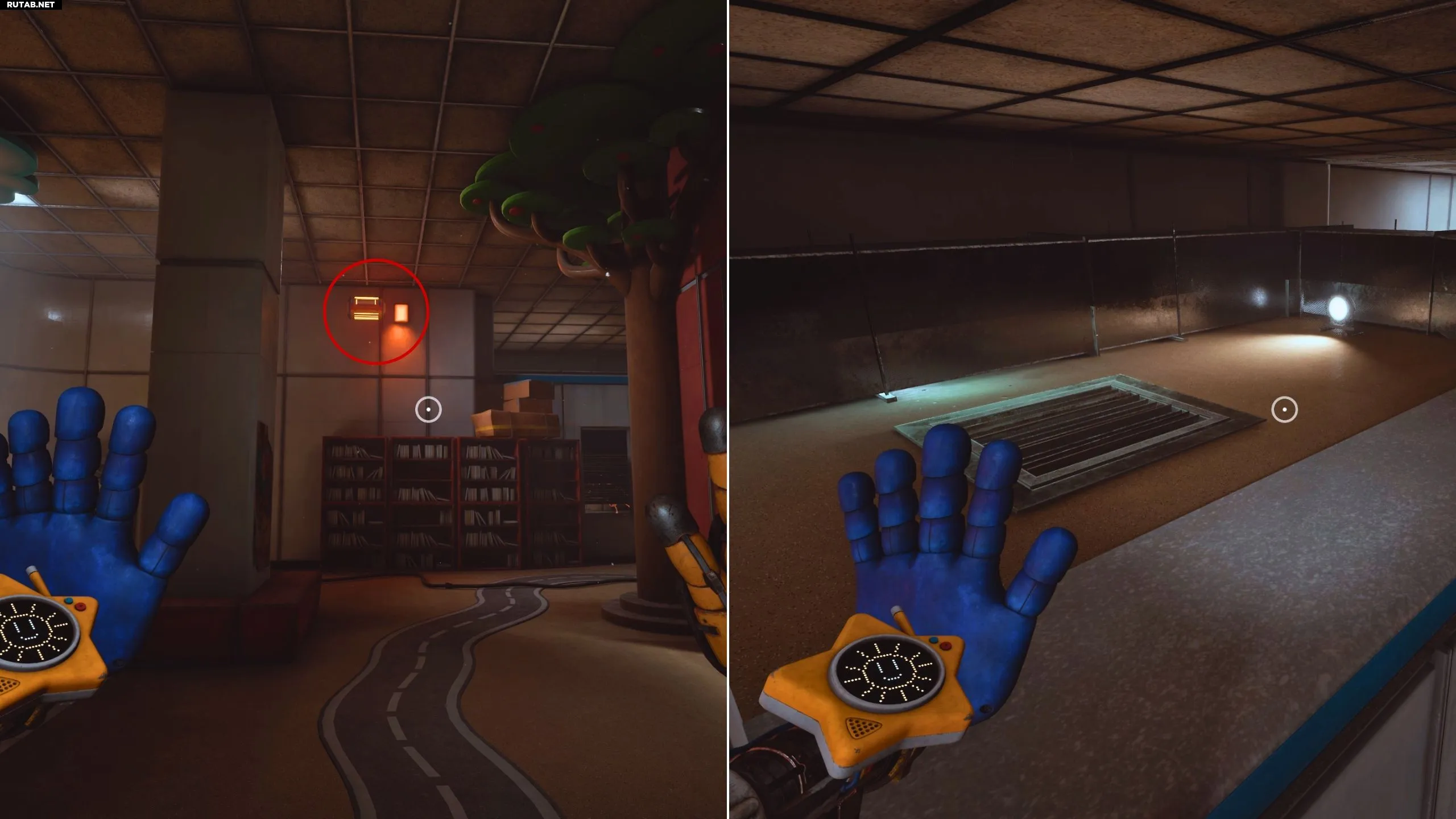 Продолжайте двигаться по вентиляционной шахте до самого конца. Посмотрите вверх, и вы увидите перекладину для GrabPack. Зацепившись за неё и повиснув, посмотрите вниз — вы увидите ещё одну вентиляционную решётку. Взаимодействуйте с ней с помощью второй руки GrabPack, чтобы пролезть дальше и упасть в одну из запертых комнат.
