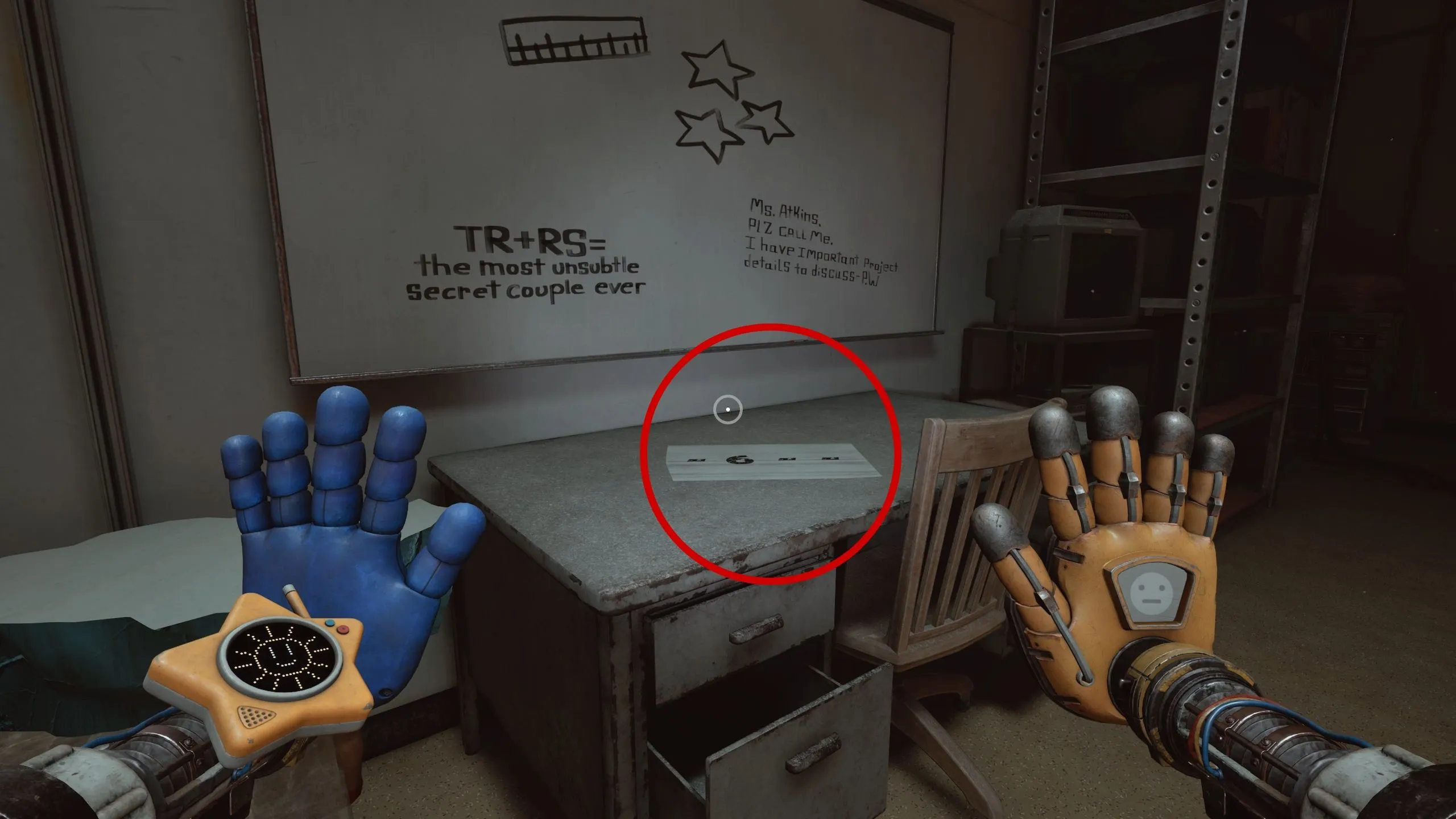 Листок с последней цифрой кода от шкафчика в комнате побега от Хагги Вагги находится в помещении, в которое вы попали через дыру в стене, чтобы забрать третью батарею. Он лежит на столе под белой доской.