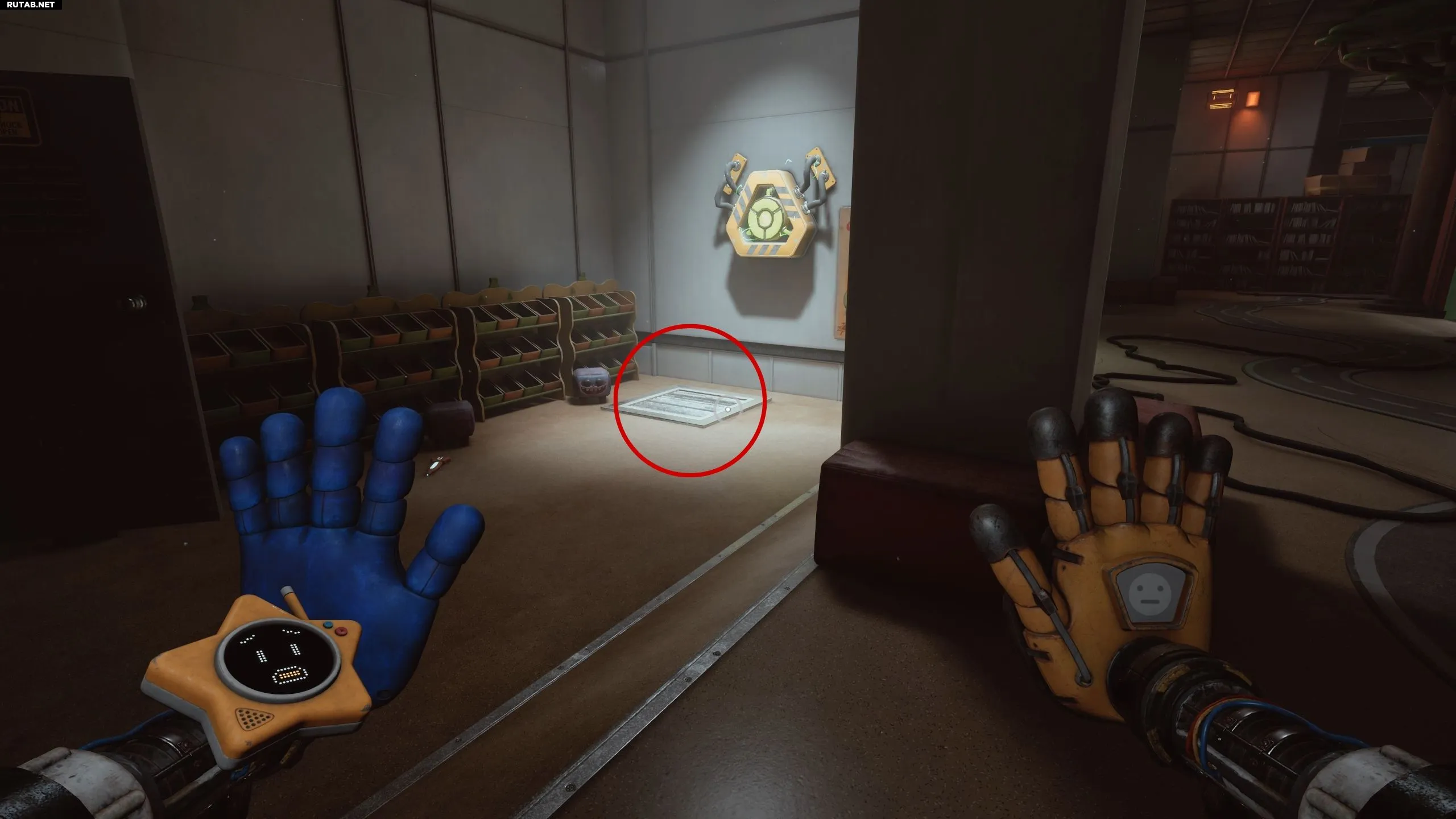 Чтобы получить первую батарею для зарядки дверной панели в комнате Хагги Вагги, нужно пройти через фиолетовую дверь направо, пока не окажетесь в зоне со стеллажами для обуви и электрическим щитком. На полу вы увидите вентиляционную решётку, которую можно открыть и залезть внутрь.