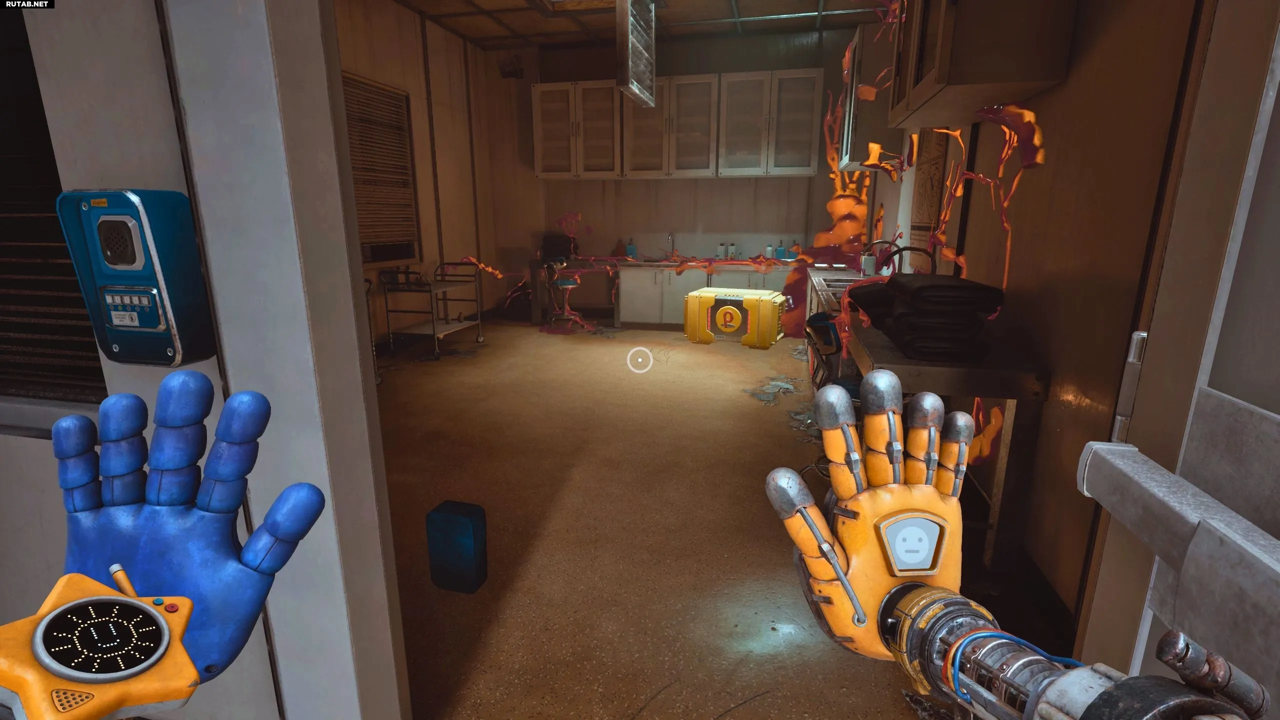 Добыть третью батарею для зарядки дверных панелей в комнате побега от Хагги Вагги в Poppy Playtime: Chapter 5 немного сложнее. Выйдя из предыдущей комнаты, где вы нашли вторую батарею, зайдите в помещение напротив стола. Там вы обнаружите терминал проектора, закрытый ящиком.