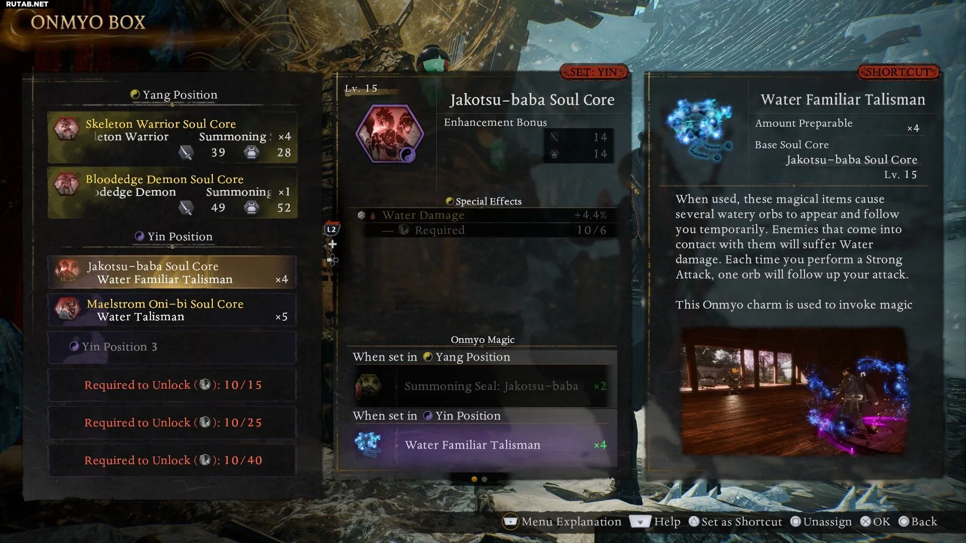 - Водный фамилиар: Это наш основной способ наложения ослабления «Промокание» на врагов. Держитесь близко и бейте цели сильными атаками, чтобы намочить их, заставляя получать на 20% больше физического урона. Этот навык можно получить из ядра души Дзякотсу-Бабы.