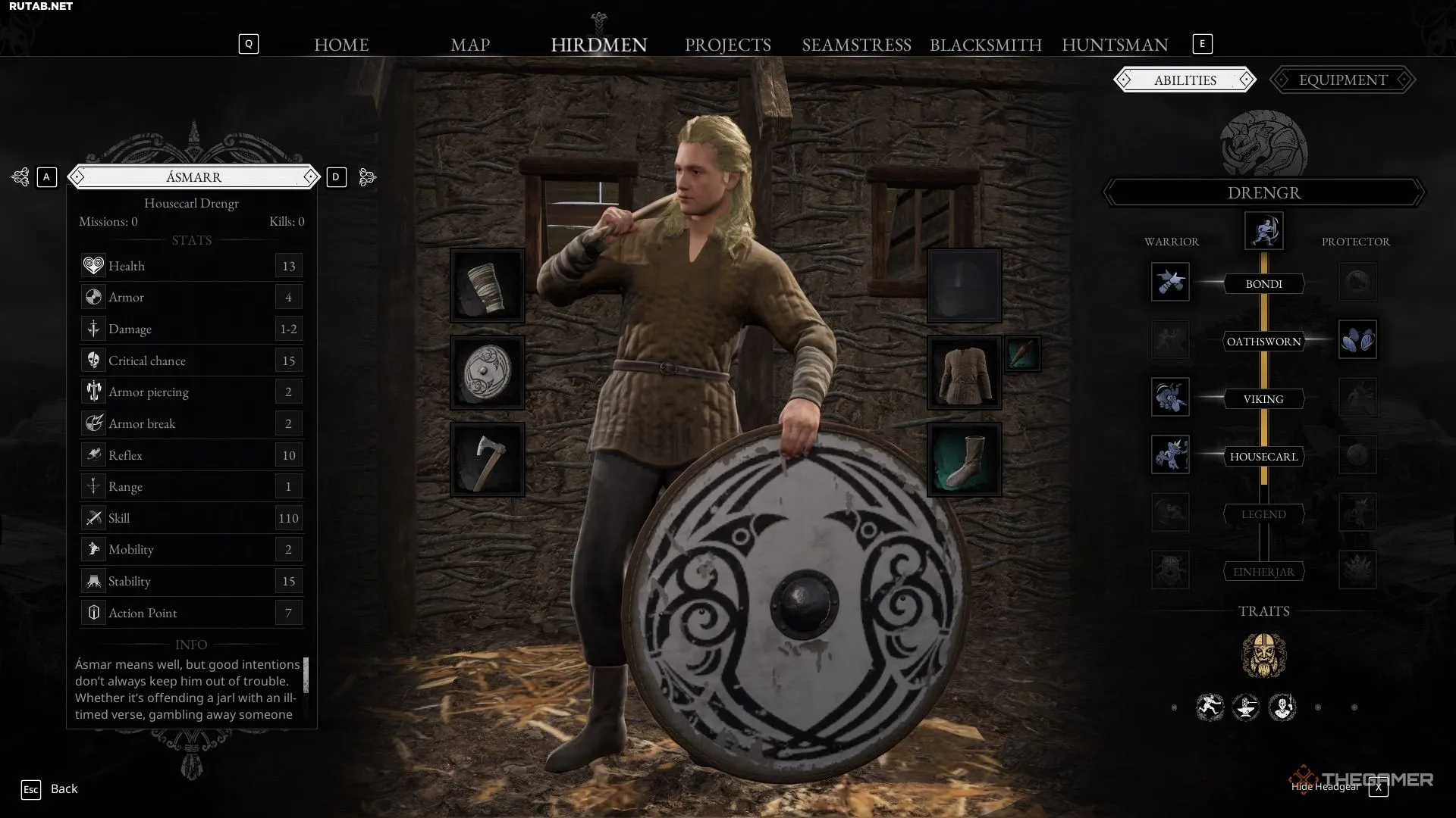 Чтобы проверить успехи отряда, добавить новые способности или сменить снаряжение, зайдите во вкладку Хирдмены и выберите нужного бойца.