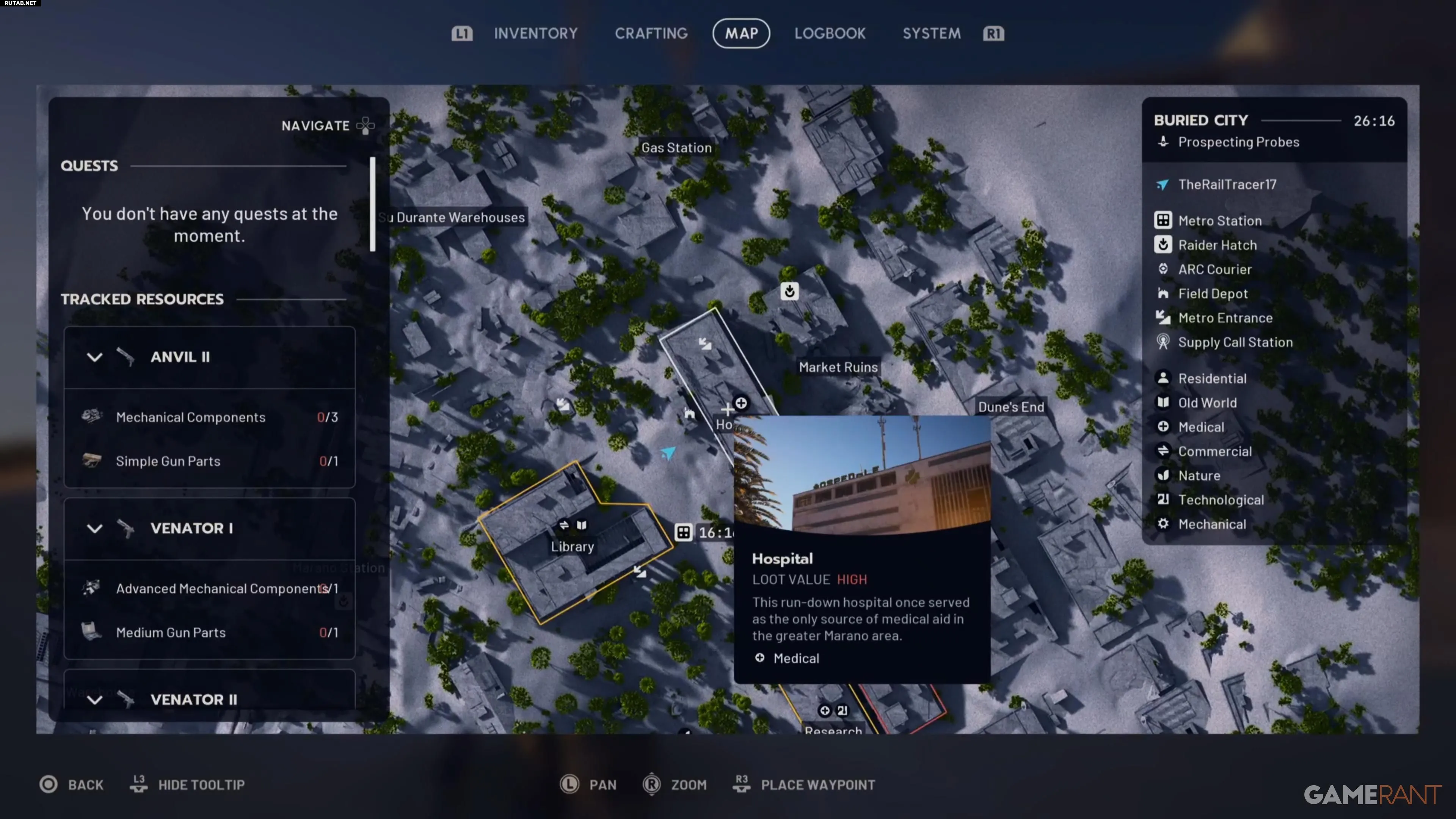 Лучшая карта для поиска лабораторных реагентов — Затонувший город (Buried City). На ней расположено множество медицинских зданий, и вы можете проверить любое из них. После начала матча посмотрите, находитесь ли вы рядом с Госпиталем или аптекой, такой как Piazza Arbusto или Plaza Rosa. В аптеках двери придется взламывать, поэтому убедитесь, что поблизости нет враждебных рейдеров или ARC.