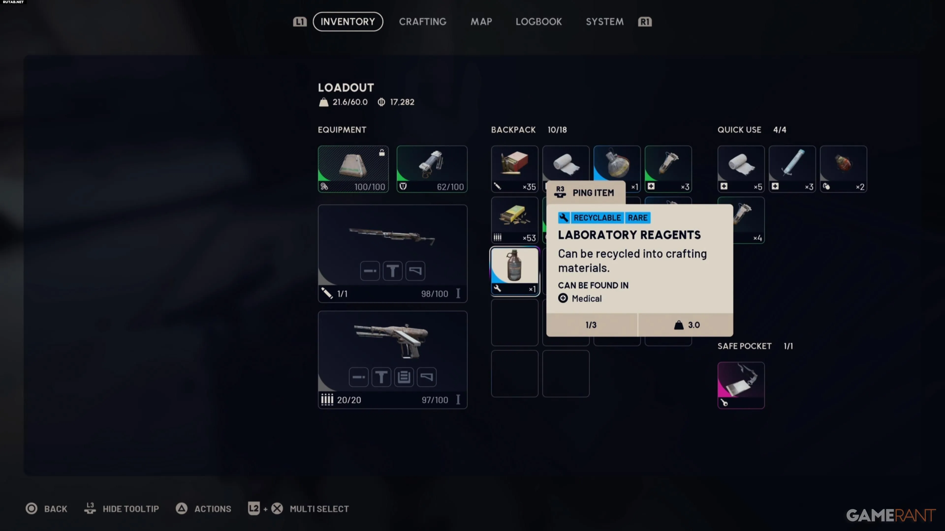Вы можете переносить 3 лабораторных реагента в одном слоте, и каждый из них продается за 2000 монет. При переработке этого медицинского предмета вы получите 16 химикатов и 3 простых взрывчатки, которые полезны для крафта взрывчатки. Так как вам нужно всего три штуки, а один слот позволяет их унести, можно использовать Модуль добычи MK 1. Этот модуль можно купить у Лэнса, создать на верстаке или получить через обмен на свободный набор модулей.