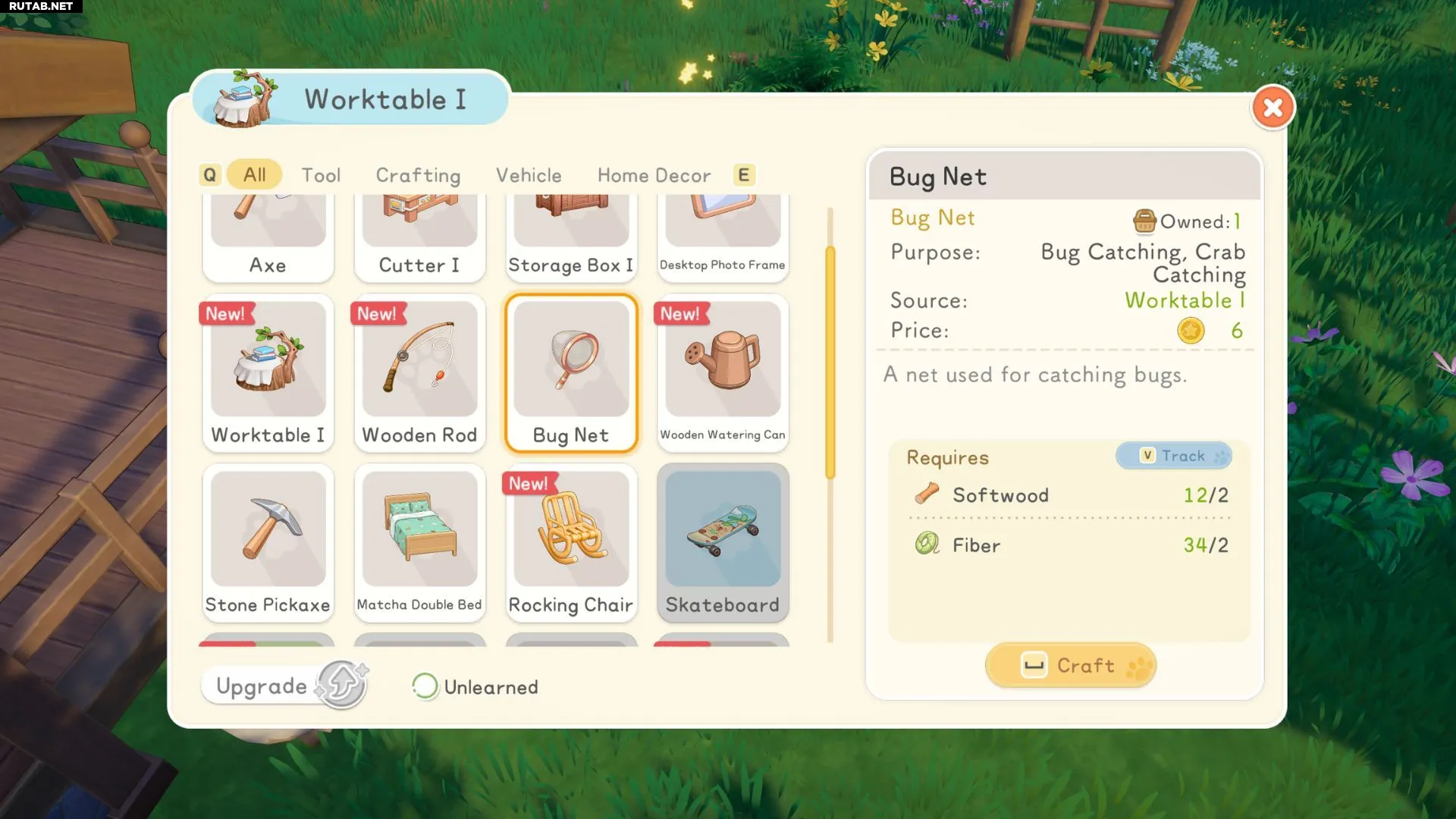 Перед тем как начать ловлю, необходимо создать сачок. Это можно сделать после прохождения обучения. Для создания сачка понадобится: 2 единицы волокна и 2 единицы мягкой древесины. Оба материала легко добываются, рубя деревья и небольшие кусты. Собрав ресурсы, подойдите к верстаку и создайте сачок.