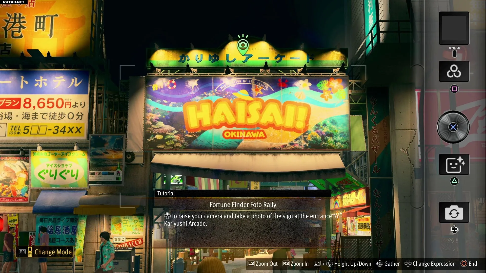 Это необязательное занятие включает в себя фотографирование достопримечательностей как в Даунтаун Рюкю, так и в Камуротё. Сделав снимок рекомендованного места, вы завершите побочную историю. Фотографии можно делать с разными фильтрами и в разное время суток.
