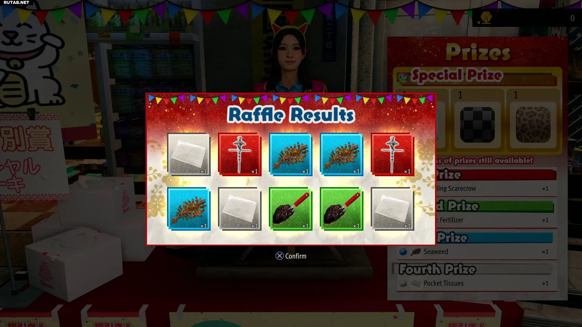 После разговора с ним Кирю получит 10 бесплатных лотерейных билетов и приглашение поучаствовать в розыгрыше. Чтобы начать мини-игру «Лотерея Даунтаун Рюкю», нужно подойти к стойке регистрации поблизости и пообщаться с Винни-тян.