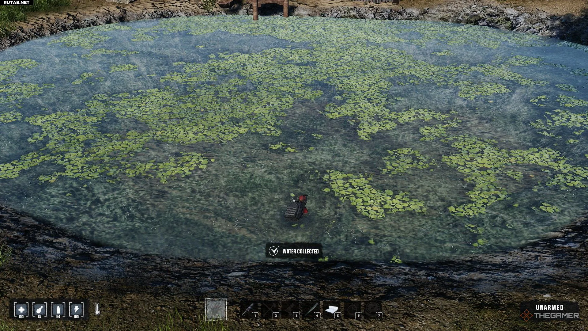 Воду можно собрать с помощью дождевых коллекторов, используя пустую бутылку и взаимодействуя (удерживая F) с прудом (вы получите грязную воду) или находя бутылки с чистой водой.