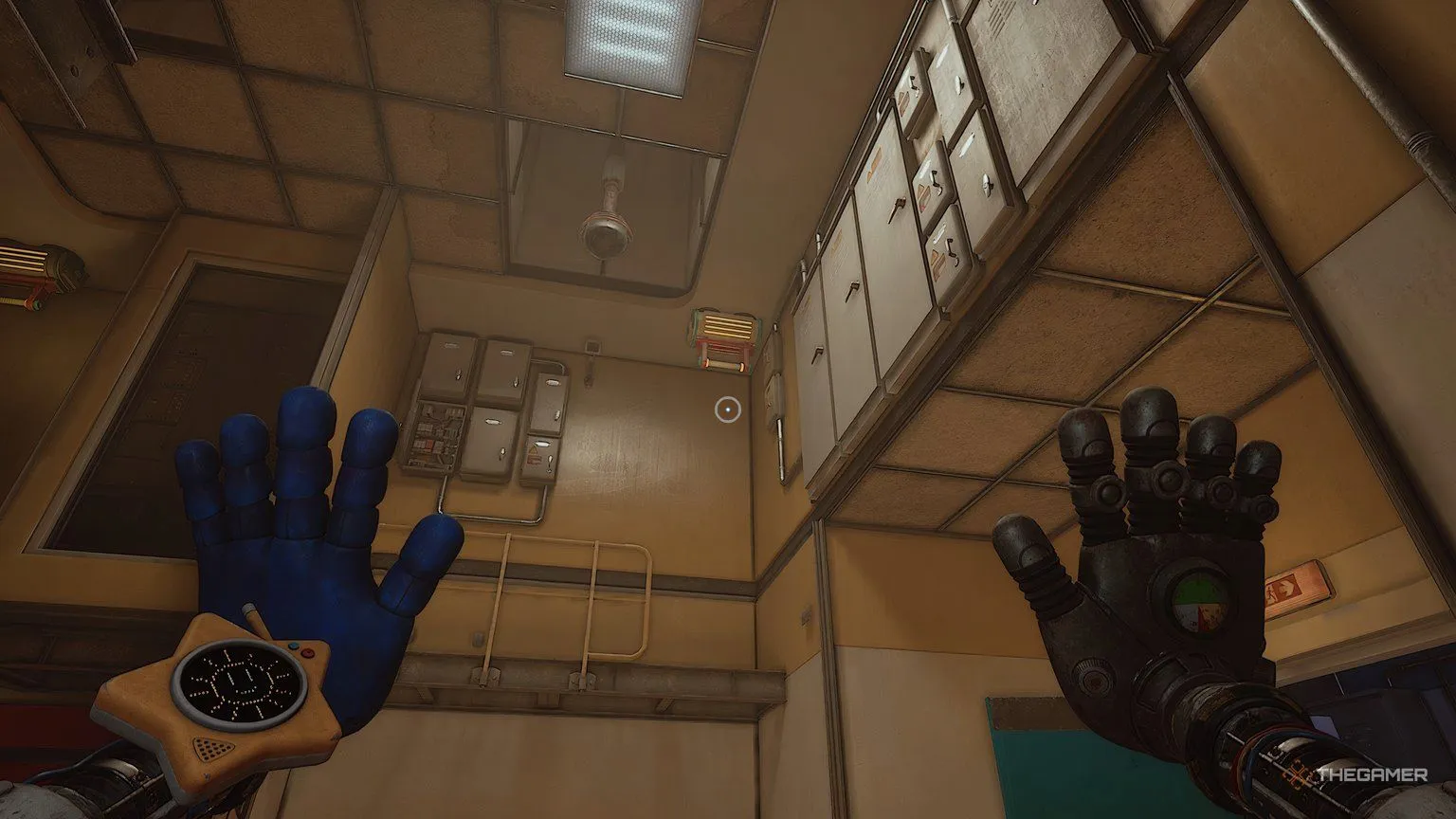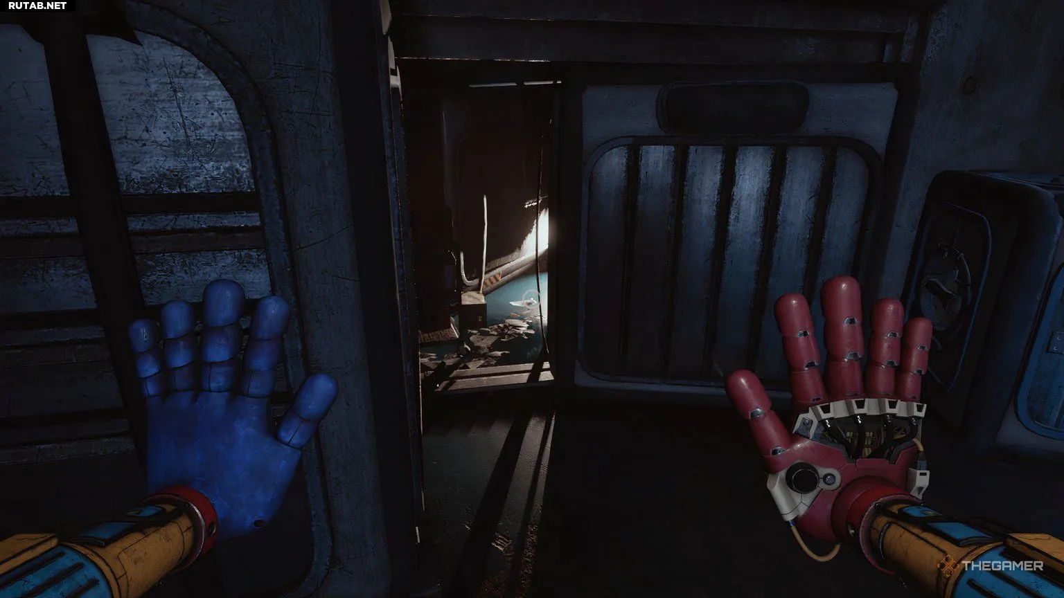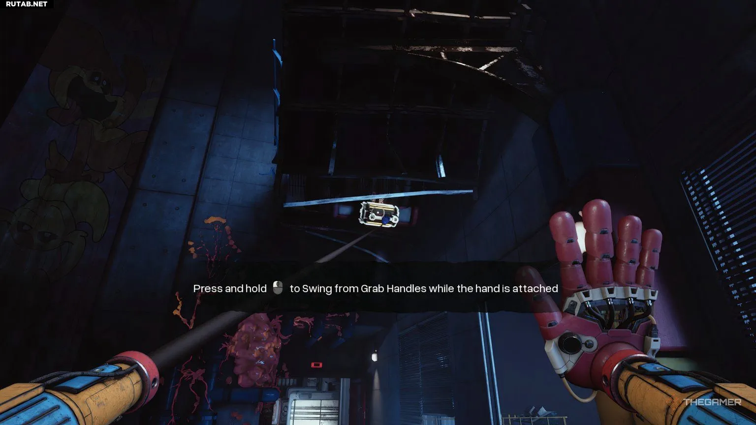 Вам нужно будет использовать давящую руку, чтобы сломать вентиляционную решётку, через которую затем можно проползти. Выбравшись из вентиляции, вы увидите точки для захвата на стене, но они не будут работать правильно. Вместо этого посмотрите вверх, и вы найдёте крюки, за которые можно ухватиться, чтобы подтянуться.