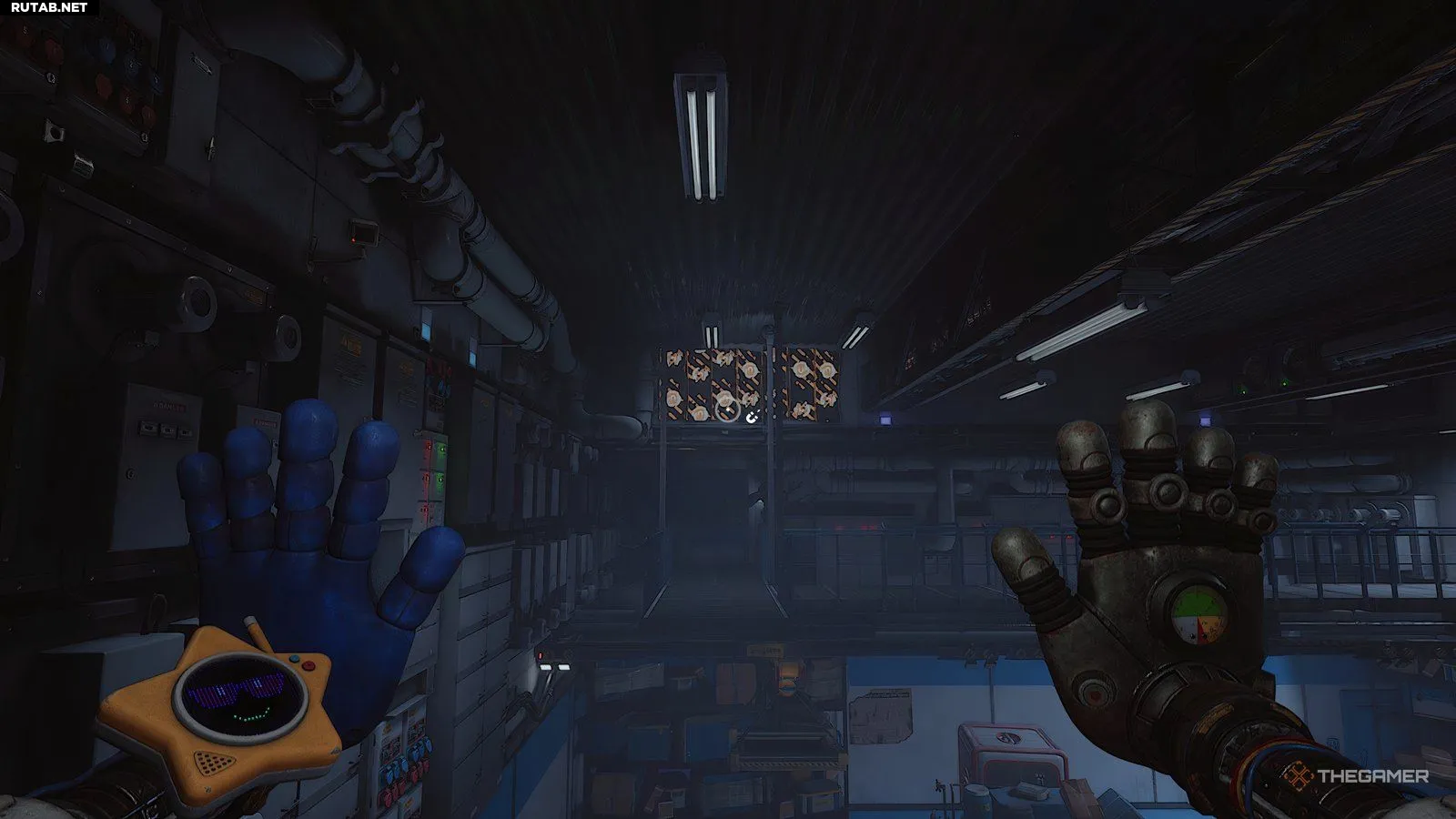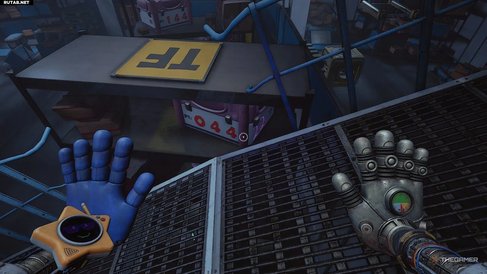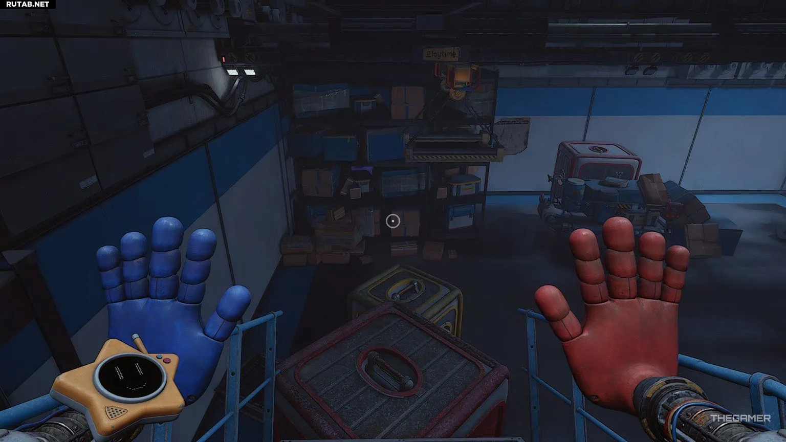 Попав в новую зону, вы получите следующую подзадачу — обыскать инженерную мастерскую. Прежде чем что-либо делать, пройдите до стены напротив входа и загляните за одну из тележек, чтобы найти записку. После этого используйте синюю руку, чтобы ухватиться за подвижный механизм на потолке и расположить его над штабелем поддонов, который преграждает путь.
